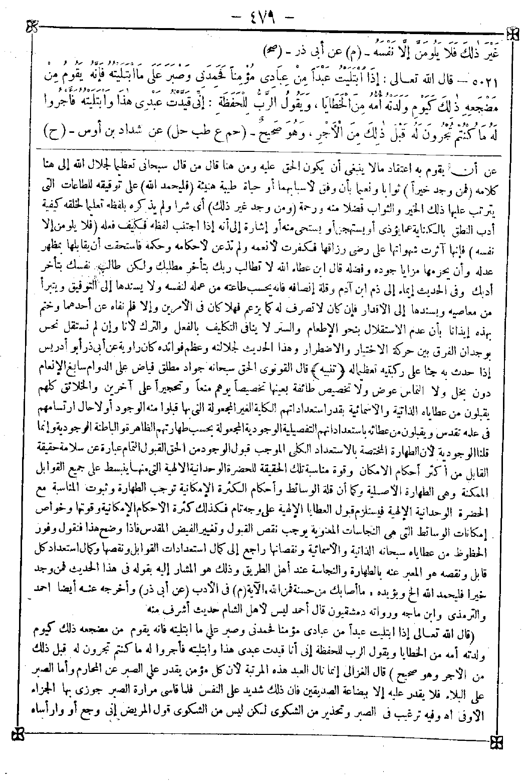6021 - (قال تعالى إذا ابتليت عبدا من عبادي مؤمنا فحمدني وصبر على ما ابتليته فإنه يقوم من مضجعه ذلك كيوم ولدته أمه من الخطايا ويقول الرب للحفظة إني أنا قيدت عبدي وابتليته فأجروا له ما كنتم تجرون له قبل ذلك من الأجر وهو صحيح) قال الغزالي: إنما نال العبد هذه المرتبة لأن كل مؤمن يقدر على الصبر على المحارم وأما الصبر على البلاء فلا يقدر عليه إلا ببضاعة الصديقين فإن ذلك شديد على النفس فلما قاسى مرارة الصبر جوزي بها الجزاء الأوفى اه. وفيه ترغيب في الصبر وتحذير من الشكوى لكن ليس من الشكوى قول المريض إني وجع أو وارأساه -[480]- إذا اشتد به الوجع ونحو ذلك وقد ترجم البخاري باب ما رخص للمريض أن يقول إني وجع قال الطبري: وقد اختلف في ذلك والتحقيق أن الألم لا يقدر أحد على دفعه والنفوس مجبولة على وجدان ذلك فلا يستطاع تغييرها عما جبلت وإنما كلف العبد أن لا يقع منه حال المرض أو المصيبة ما له سبيل إلى تركه كالمبالغة في التأوه ومزيد الجزع والضجر وأما مجرد الشكوى فلا
