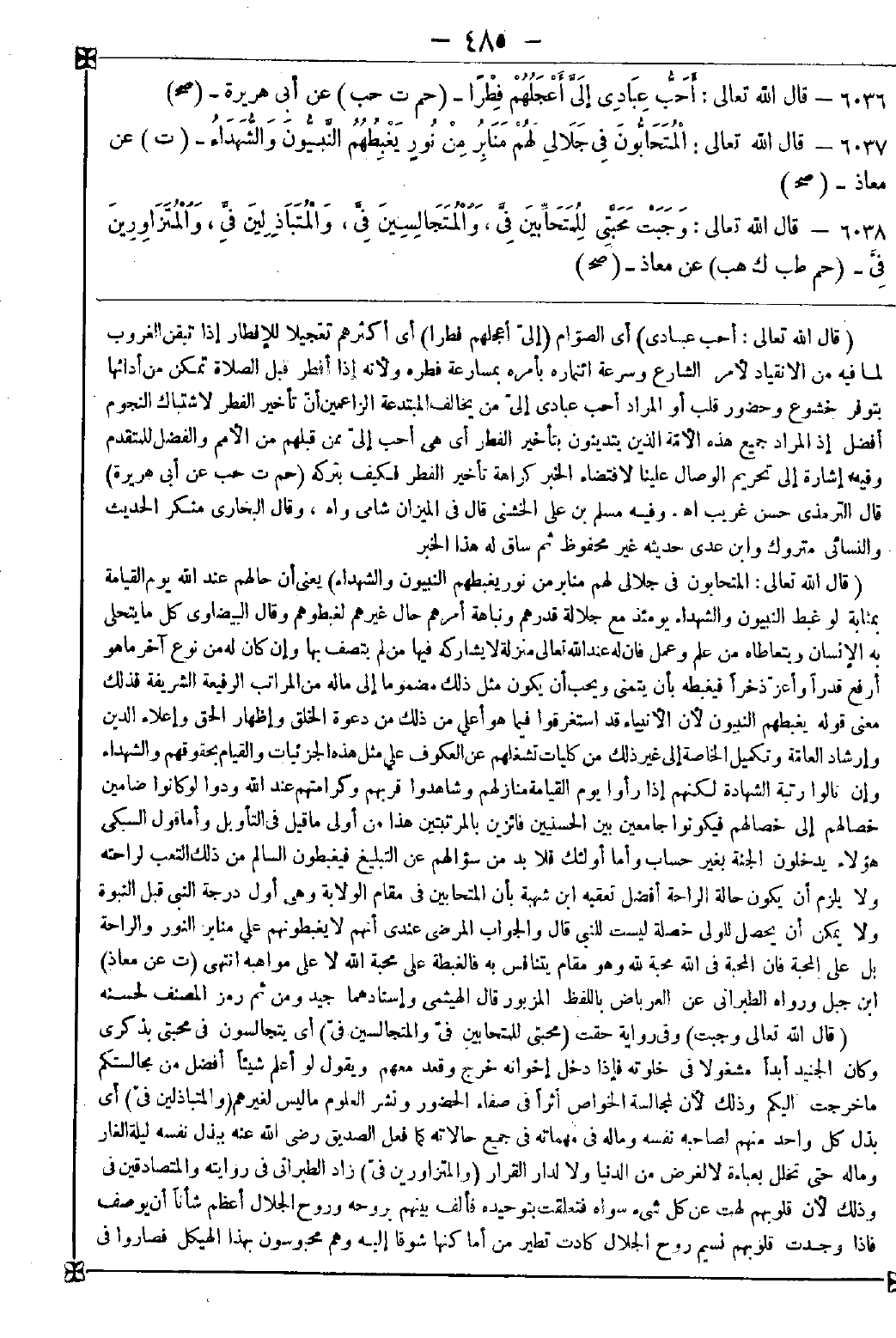 6037 - (قال الله تعالى: المتحابون في جلالي لهم منابر من نور يغبطهم النبيون والشهداء) يعني أن حالهم عند الله يوم القيامة بمثابة لو غبط النبيون والشهداء يومئذ مع جلالة قدرهم ونباهة أمرهم حال غيرهم لغبطوهم وقال البيضاوي: كل ما يتحلى به الإنسان ويتعاطاه من علم وعمل فإن له عند الله تعالى منزلة لا يشاركه فيها من لم يتصف بها وإن كان له من نوع آخر ما هو أرفع قدرا وأعز ذخرا فيغبطه بأن يتمنى ويحب أن يكون مثل ذلك مضموما إلى ما له من المراتب الرفيعة الشريفة فذلك معنى قوله يغبطهم النبيون لأن الأنبياء قد استغرقوا فيما هو أعلى من ذلك من دعوة الخلق وإظهار الحق وإعلاء الدين وإرشاد العامة وتكميل الخاصة إلى غير ذلك من كليات تشغلهم عن العكوف على مثل هذه الجزئيات والقيام بحقوقهم والشهداء وإن نالوا رتبة الشهادة لكنهم إذا رأوا يوم القيامة منازلهم وشاهدوا قربهم وكرامتهم عند الله ودوا لو كانوا ضامين خصالهم إلى خصالهم فيكونوا جامعين بين الحسنيين فائزين بالمرتبتين هذا من أولى ما قيل في التأويل وأما قول السبكي هؤلاء يدخلون الجنة بغير حساب وأما أولئك فلا بد من سؤالهم عن التبليغ فيغبطون السالم من ذلك التعب لراحته ولا يلزم أن يكون حالة الراحة أفضل تعقبه ابن شهبة بأن المتحابين في مقام الولاية وهي أول درجة النبي قبل النبوة ولا يمكن أن يحصل للولي خصلة ليست للنبي قال: والجواب المرضي عندي أنهم لا يغبطونهم على منابر النور والراحة بل على المحبة فإن المحبة في الله محبة لله وهو مقام يتنافس به فالغبطة على محبة الله لا على مواهبه انتهى