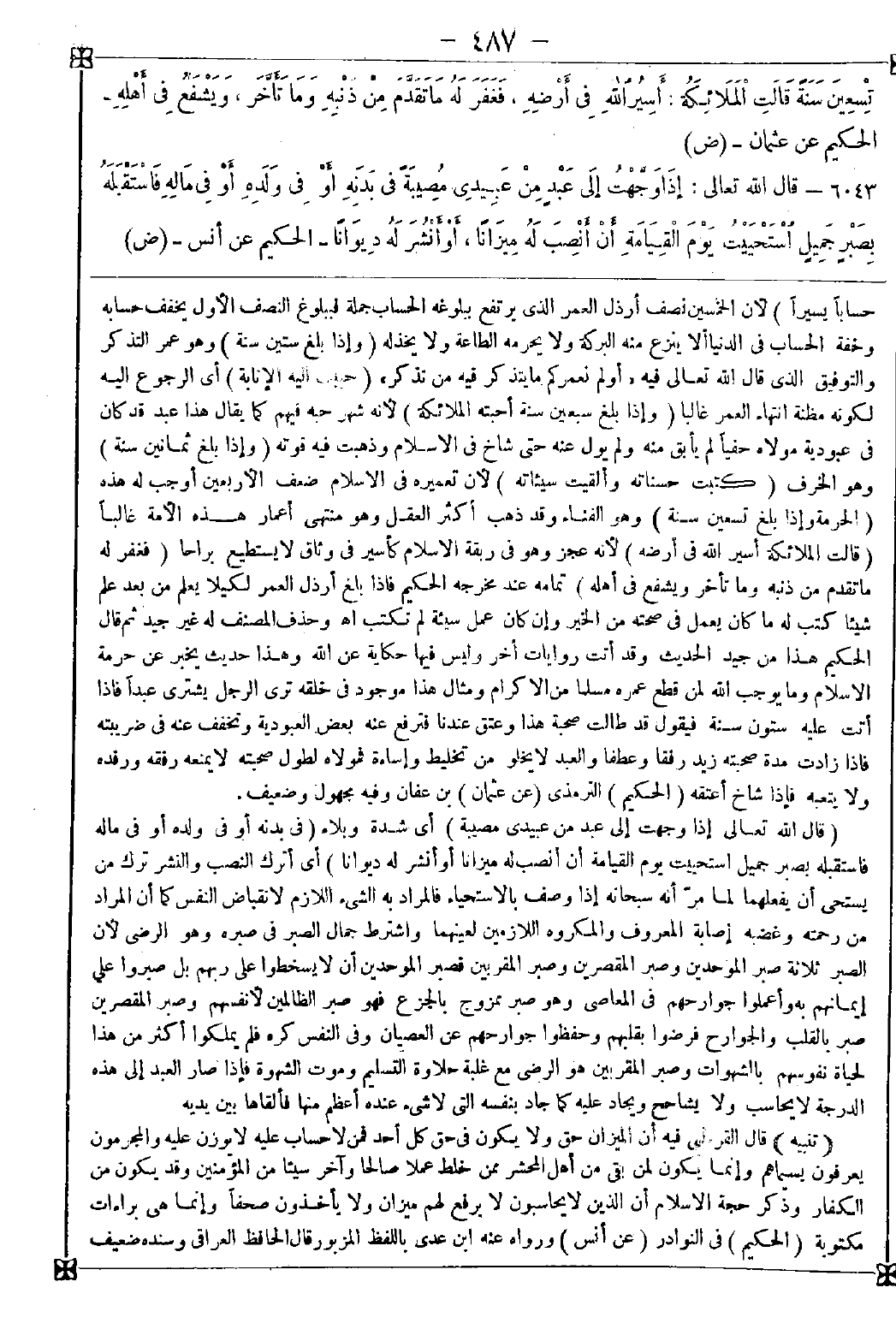 6043 - (قال الله تعالى إذا وجهت إلى عبد من عبيدي مصيبة) أي شدة وبلاء (في بدنه أو في ولده أو في ماله فاستقبله بصبر جميل استحييت يوم القيامة أن أنصب له ميزانا أو أنشر له ديوانا) أي أترك النصب والنشر ترك من يستحي أن يفعلهما لما مر أنه سبحانه إذا وصف بالاستحياء فالمراد به الشيء اللازم لانقباض النفس كما أن المراد من رحمته وغضبه إصابة المعروف والمكروه اللازمين لعينهما واشترط جمال الصبر في صبره وهو الرضى لأن الصبر ثلاثة صبر الموحدين وصبر المقصرين وصبر المقربين فصبر الموحدين أن لا يسخطوا على ربهم بل صبروا على إيمانهم به وأعملوا جوارحهم في المعاصي وهو صبر ممزوج بالجزع فهو صبر الظالمين لأنفسهم وصبر المقصرين صبر بالقلب والجوارح فرضوا بقلبهم وحفظوا جوارحهم عن العصيان وفي النفس كره فلم يملكوا أكثر من هذا لحياة نفوسهم بالشهوات وصبر المقربين هو الرضى مع غلبة حلاوة التسليم وموت الشهوة فإذا صار العبد إلى هذه الدرجة لا يحاسب ولا يشاحح ويجاد عليه كما جاد بنفسه التي لا شيء عنده أعظم منها فألقاها بين يديه