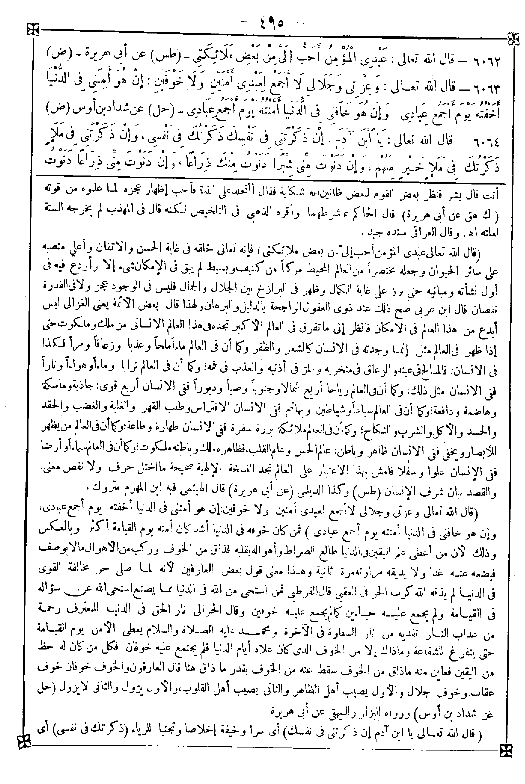 6063 - (قال الله تعالى وعزتي وجلالي لا أجمع لعبدي أمنين ولا خوفين: إن هو أمنني في الدنيا أخفته يوم أجمع عبادي وإن هو خافني في الدنيا أمنته يوم أجمع عبادي) فمن كان خوفه في الدنيا أشد كان أمنه يوم القيامة أكثر وبالعكس وذلك لأن من أعطى علم اليقين في الدنيا طالع الصراط وأهواله بقلبه فذاق من الخوف وركب من الأهوال ما لا يوصف فيضعه عنه غدا ولا يذيقه مرارته مرة ثانية وهذا معنى قول بعض العارفين لأنه لما صلى حر مخالفة القوى في الدنيا لم يذقه الله كرب الحر في العقبى. قال القرطبي: فمن استحى من الله في الدنيا مما يصنع استحى الله عن سؤاله في القيامة ولم يجمع عليه حياءين كما لم يجمع عليه خوفين وقال الحرالي: نار الحق في الدنيا للمعترف رحمة من عذاب النار تفديه من نار السطوة في الآخرة ومحمد عليه الصلاة والسلام يعطى الأمن يوم القيامة حتى يتفرغ للشفاعة وما ذاك إلا من الخوف الذي كان علاه أيام الدنيا فلم يجتمع عليه خوفان فكل من كان له حظ من اليقين فعاين منه ما ذاق من الخوف سقط عنه من الخوف بقدر ما ذاق هنا قال العارفون: والخوف خوفان خوف عقاب وخوف جلال والأول يصيب أهل الظاهر والثاني يصيب أهل القلوب والأول يزول والثاني لا يزول