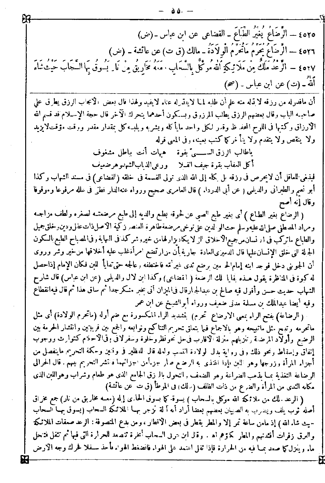 4527 - (الرعد ملك من ملائكة الله موكل بالسحاب) (1) يسوقه كما يسوق الحادي إبله (معه مخاريق من نار) جمع مخراق أصله ثوب يلف ويضرب به الصبيان بعضهم بعضا أراد أنه آلة تزجر بها الملائكة السحاب (يسوق بها السحاب حيث شاء الله) إذ ما من ساعة تمر إلا والمطر يقطر في بعض الأقطار ومن بدع المتصوفة: الرعد صعقات الملائكة والبرق زفرات أفئدتهم والمطر بكاؤهم اه. وقال ابن عربي: السحاب أبخرة تتصعد للحرارة التي فيها ثم تثقل فتنحل ماء ينزل كما صعد بما فيه من الحرارة فإذا ثقل اعتمد على الهواء فانضغط الهواء فأخذ سفلا فحرك وجه الأرض -[56]- فتفوت الحرارة فصعد بوجه السحاب متراكما فمنعه من الصعود بتكاثفه فاشتعل الهواء فخلق الله من تلك الشعلة ملكا سماه برقا فأصابه الضوء ثم انطفأ بقوة الريح كالسراج فزال مع بقاء عينه فزال كونه برقا وبقي العين كونا يسبح الله ثم صدع الوجه الذي يلي الأرض من السحاب فلما مازجه كانا كالنكاح فخلق الله من ذلك التجاور ملكا سماه رعدا يسبح بحمده فكان بعد البرق ما لم يكن البرق خليا فكل برق لا بد أن يكون الرعد بعده لأن الهواء يصعد مشتعلا فيخلقه الله ملكا يسميه برقا وبعد هذا يصعد أسفل السحاب فيخلق الله الرعد فيسبح بحمده وثم بروق هي ملائكة يخلقها الله في زمن الصيف من شدة حر الجو