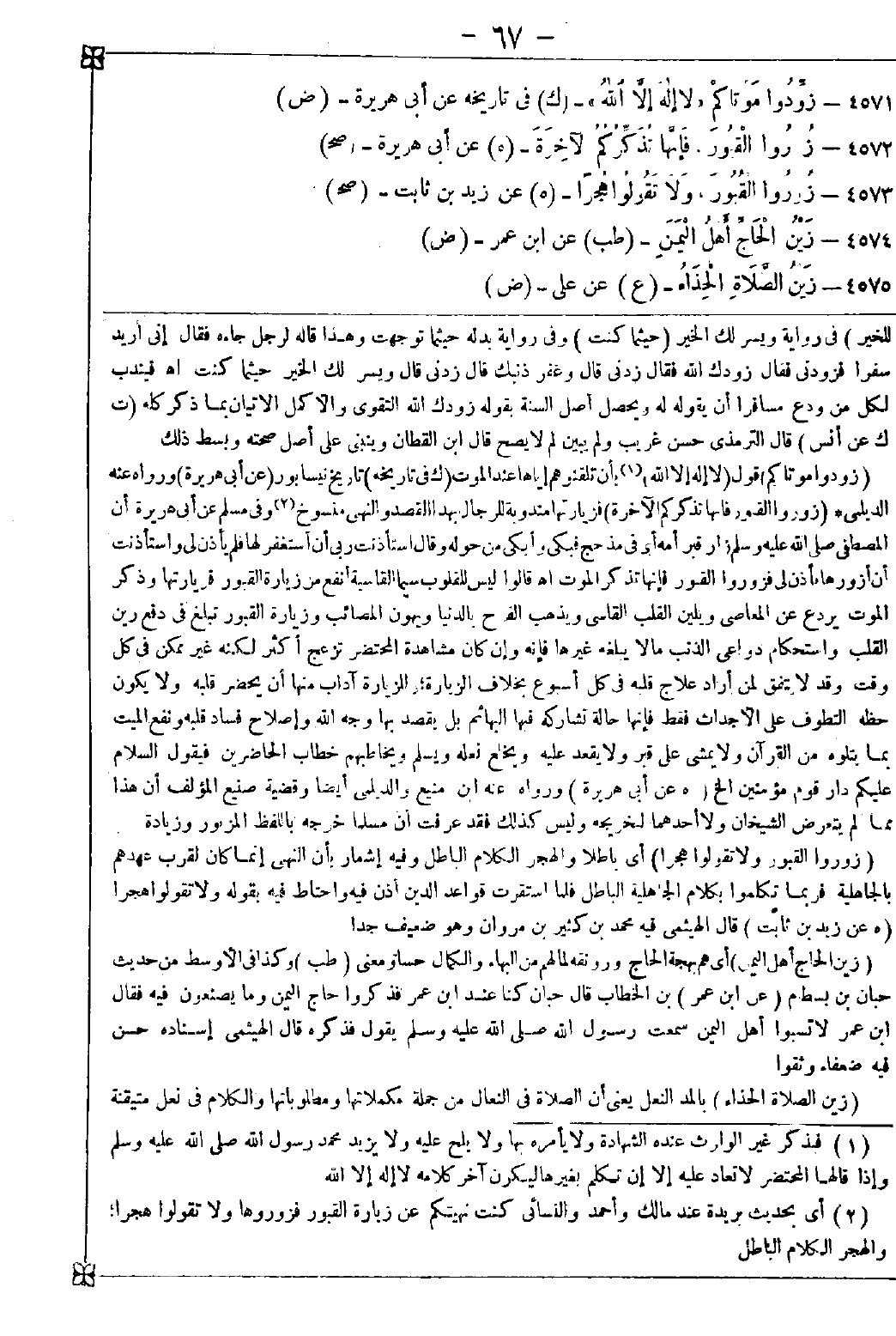 4573 - (زوروا القبور ولا تقولوا هجرا) أي باطلا والهجر الكلام الباطل وفيه إشعار بأن النهي إنما كان لقرب عهدهم بالجاهلية فربما تكلموا بكلام الجاهلية الباطل فلما استقرت قواعد الدين أذن فيه واحتاط فيه بقوله ولا تقولوا هجرا