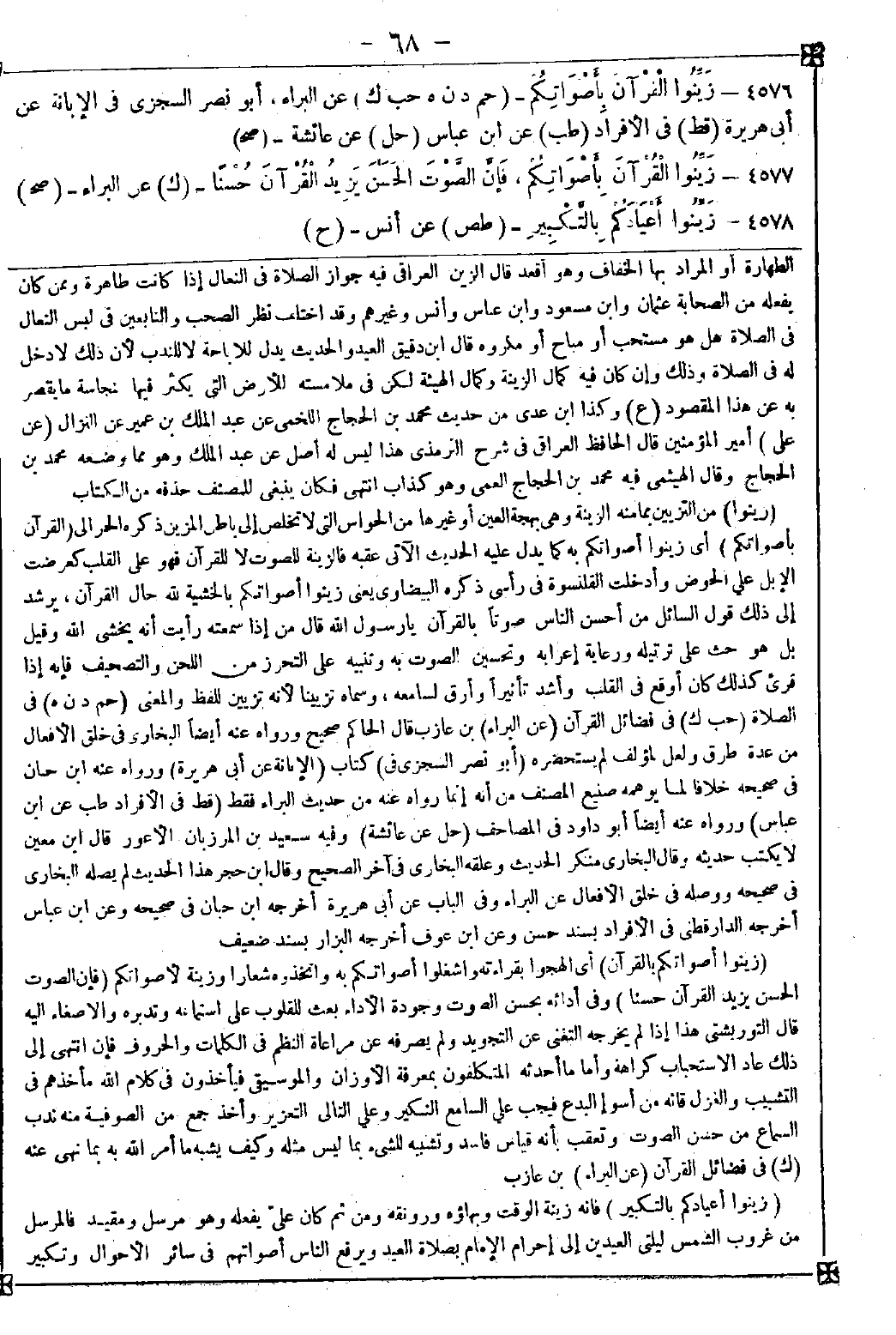 4576 - (زينوا) من التزيين بما منه الزينة وهي بهجة العين أو غيرها من الحواس التي لا تخلص إلى باطن المزين ذكره الحرالي (القرآن بأصواتكم) أي زينوا أصواتكم به كما يدل عليه الحديث الآتي عقبه فالزينة للصوت لا للقرآن فهو على القلب كعرضت الإبل على الحوض وأدخلت القلنسوة في رأسي ذكره البيضاوي يعني زينوا أصواتكم بالخشية لله حال القرآن يرشد إلى ذلك قول السائل: من أحسن الناس صوتا بالقرآن يا رسول الله قال: من إذا سمعته رأيت أنه يخشى الله وقيل: بل هو حث على ترتيله ورعاية إعرابه وتحسين الصوت به وتنبيه على التحرز من اللحن والتصحيف فإنه إذا قرئ كذلك كان أوقع في القلب وأشد تأثيرا وأرق لسامعه وسماه تزيينا لأنه تزيين للفظ والمعنى