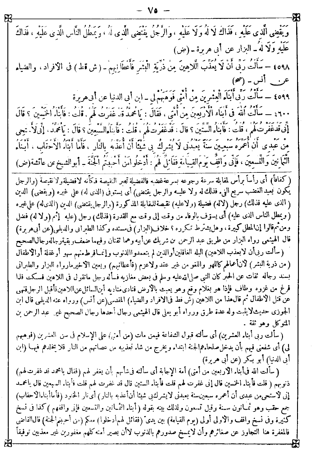 4600 - (سألت الله في أبناء الأربعين من أمتي) أمة الإجابة أي سألته في شأنهم بأن يغفر لهم (فقال يا محمد قد غفرت لهم) ذنوبهم (قلت فأبناء الخمسين قال إني غفرت لهم قلت فأبناء الستين قال قد غفرت لهم قلت فأبناء السبعين قال يا محمد إني لأستحي من عبدي أن أعمره سبعين سنة يعبدني لا يشرك بي شيئا أن أعذبه بالنار) أي نار الخلود (فأما أبناء الأحقاب) جمع حقب وهو ثمانون سنة وقيل تسعون ولذلك بينه بقوله (أبناء الثمانين والتسعين فإني واقفهم) كذا في نسخ كثيرة وفي نسخ واقف والأولى أولى (يوم القيامة) بين يدي (فقائل لهم أدخلوا) معكم (من أحببتم الجنة) قال القاضي: فالمغفرة هنا التجاوز عن صغائرهم وأن لا يمسخ صدورهم بالذنوب لا أن يصير أمته كلهم مغفورين غير معذبين توفيقا -[76]- بينه وبين ما دل من الكتاب والسنة على أن الفاسق من أهل القبلة يعذب بالنار لكنه لا يخلد وقال الطيبي: المراد أنهم لا يجب عليهم الخلود وينالهم الشفاعة فلا يكونون كالأمم السابقة كثير منهم لعنوا بعصيانهم الأنبياء فلم تنلهم الشفاعة وعصاة هذه الأمة من عذب منهم نقى وهذب ومن مات على الشهادتين يخرج من النار وإن عذب وينالهم الشفاعة وإن اجترح الكبائر إلى غير ذلك من خصائصنا