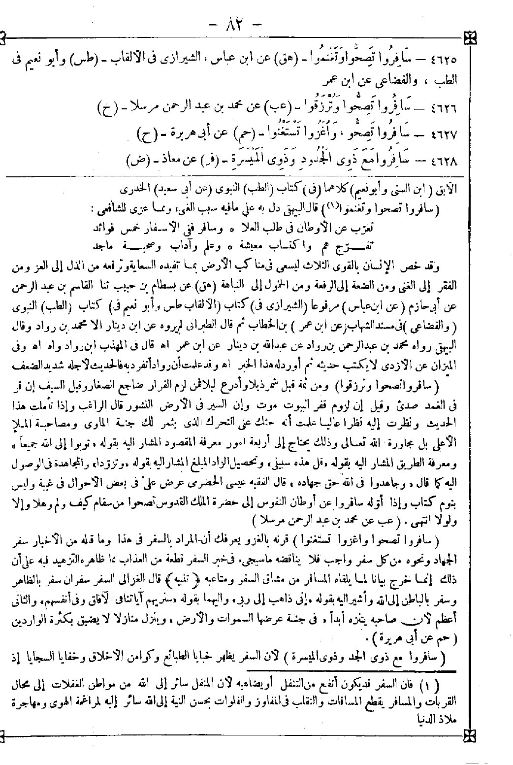 4627 - (سافروا تصحوا واغزوا تستغنوا) قرنه بالغزو يعرفك أن المراد بالسفر في هذا وما قبله من الأخبار سفر الجهاد ونحوه من كل سفر واجب فلا يناقضه ما سيجيء في خبر السفر قطعة من العذاب مما ظاهره التزهيد فيه على أن ذلك إنما خرج بيانا لما يلقاه المسافر من مشاق السفر ومتاعبه
