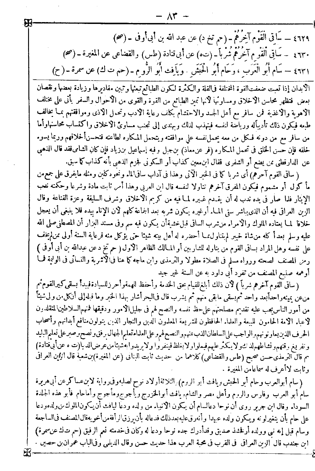 4630 - (ساقي القوم آخرهم شربا) لان ذلك أبلغ للقيام بحق الخدمة وأحفظ للهمة وأحرز للسيادة فيبدأ بسقي كبير القوم ثم من عن يمينه واحدا بعد واحد ثم يسقي ما بقي منهم ثم يشرب قال في البحر: أشار بهذا الخبر وما قبله إلى أن كل من ولي شيئا من أمور الناس يجب عليه تقديم مصلحتهم على حظ نفسه والنصح لهم في جليل الأمور ودقيقها فمنهم السلاطين المتقلدون لأعباء الأمة الحامون للبيعة والعلماء الحافظون للشريعة المعلمون الدين والتجار الذين يتولون منافع أبدانهم وأصحاب الحرف الذين يعاونونهم والواجب على السلطان الذب عنهم والنصح لهم وعلى العلماء تعليم الجهال برفق ونصح وصبر على تعليم البليد وتفريغ وقتهم ونشاطهم لذلك ولا يكثر عليهم فيملوا ولا يغلظ فينفروا ولا يريدوا به شيئا من عرض الدنيا