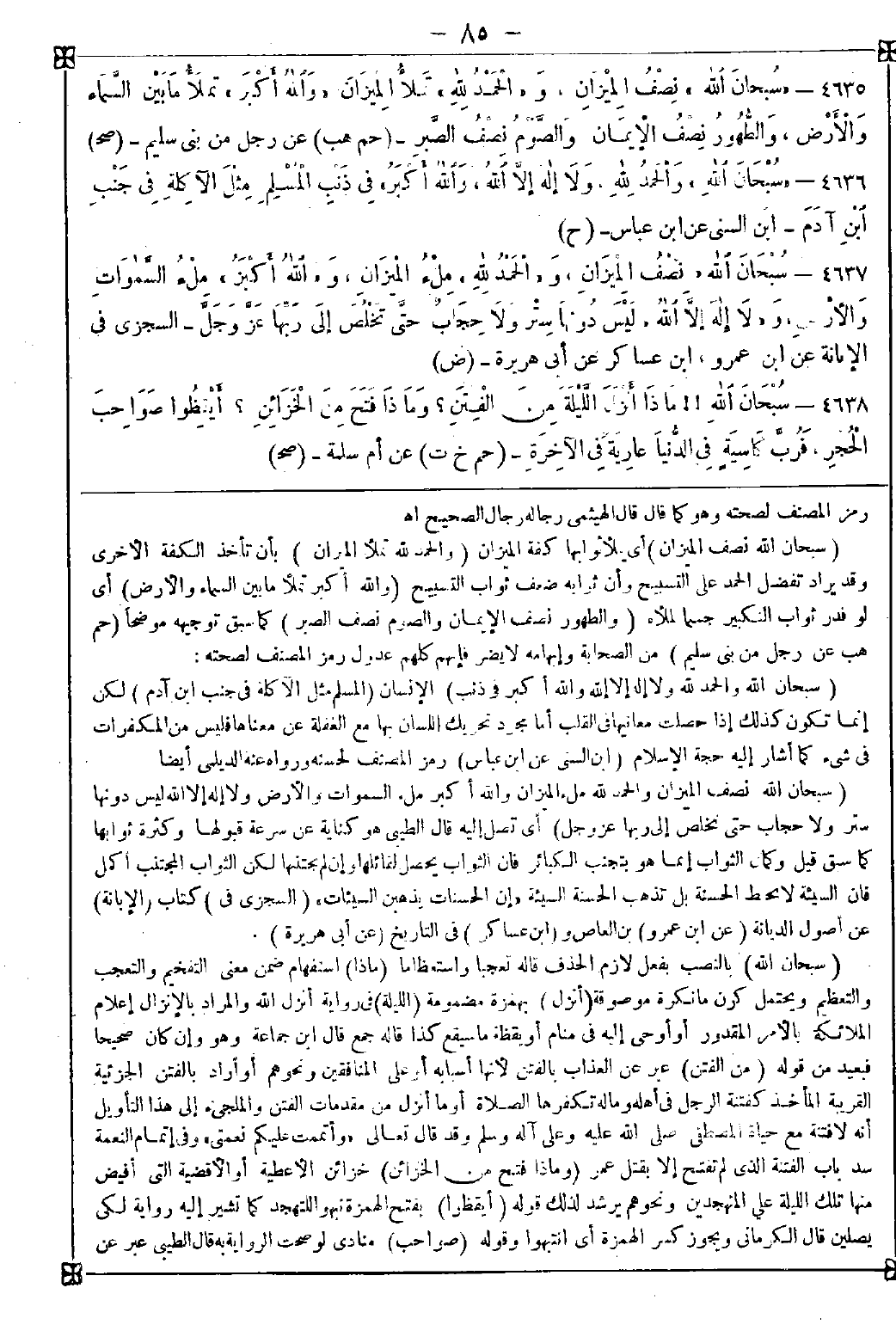 4637 - (سبحان الله نصف الميزان والحمد لله ملء الميزان والله أكبر ملء السماوات والأرض ولا إله إلا الله ليس دونها ستر ولا حجاب حتى تخلص إلى ربها عز وجل) أي تصل إليه قال الطيبي: هو كناية عن سرعة قبولها وكثرة ثوابها كما سبق قيل: وكمال الثواب إنما هو بتجنب الكبائر فإن الثواب يحصل لقائلها وإن لم يجتنبها لكن الثواب المجتنب أكمل فإن السيئة لا تحبط الحسنة بل تذهب الحسنة السيئة {إن الحسنات يذهبن السيئات}