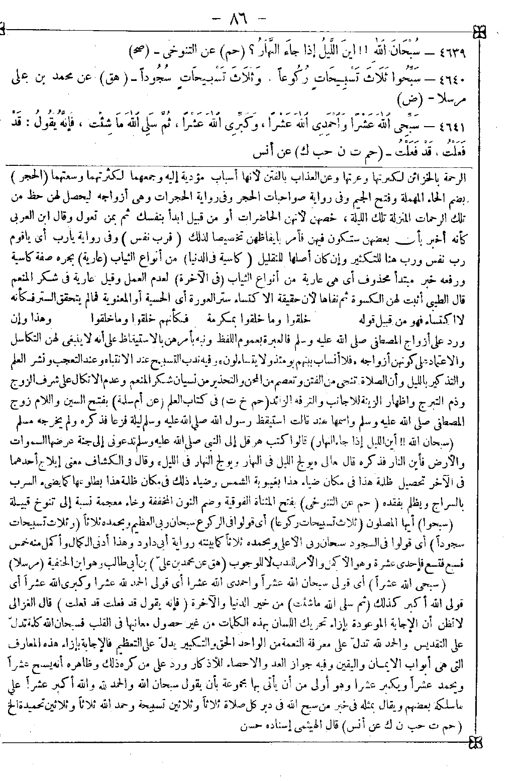 4640 - (سبحوا) أيها المصلون (ثلاث تسبيحات ركوعا) أي قولوا في الركوع سبحان ربي العظيم وبحمده ثلاثا (وثلاث تسبيحات سجودا) أي قولوا في السجود سبحان ربي الأعلى وبحمده ثلاثا كما بينته رواية أبي داود وهذا أدنى الكمال وأكمل منه خمس فسبع فتسع فإحدى عشرة وهو الأكمل والأمر للندب لا للوجوب