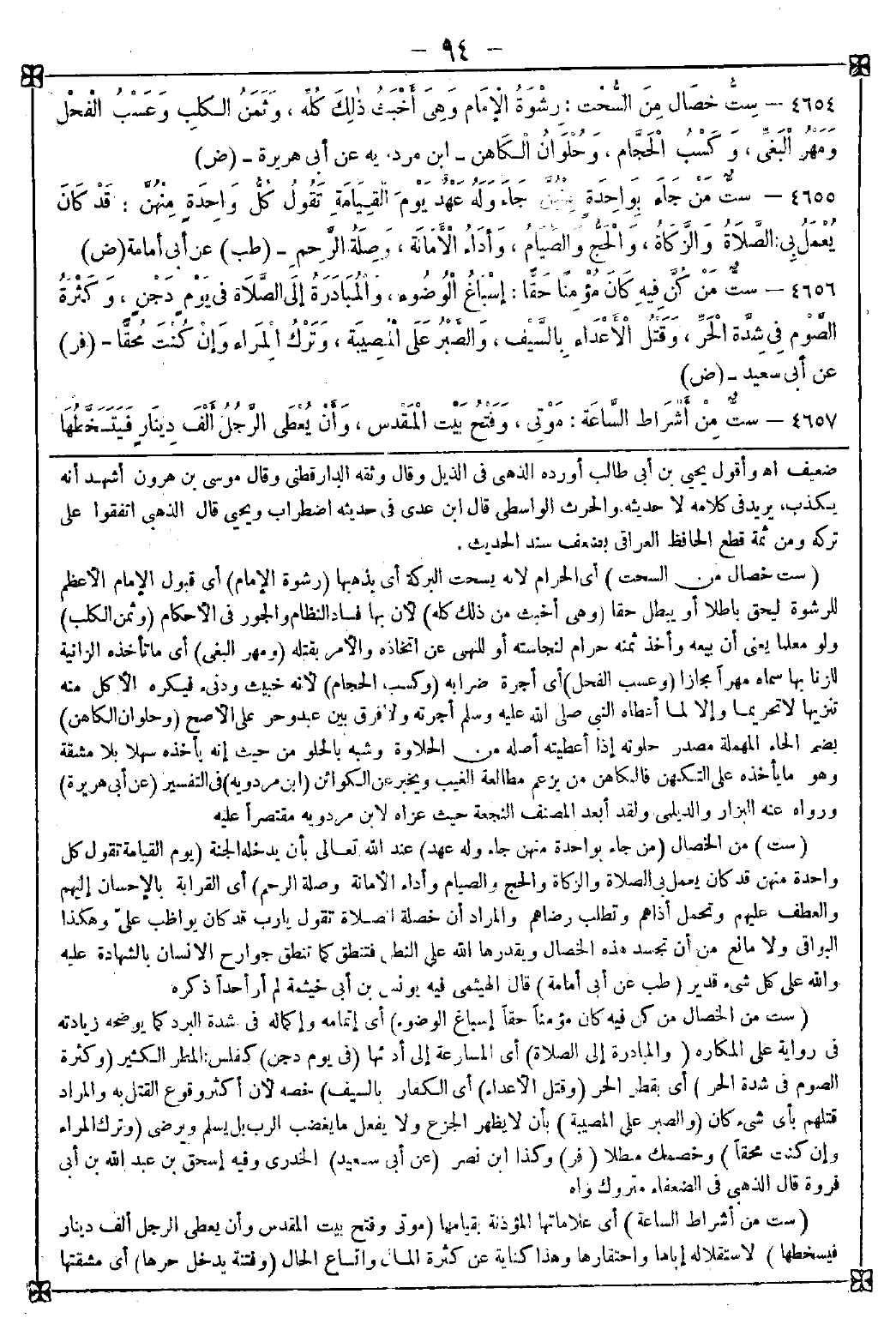 4654 - (ست خصال من السحت) أي الحرام لأنه يسحت البركة أي يذهبها (رشوة الإمام) أي قبول الإمام الأعظم للرشوة ليحق باطلا أو يبطل حقا (وهي أخبث من ذلك كله) لأن بها فساد النظام والجور في الأحكام (وثمن الكلب) ولو معلما يعني أن بيعه وأخذ ثمنه حرام لنجاسته أو للنهي عن اتخاذه والأمر بقتله (ومهر البغي) أي ما تأخذه الزانية للزنا بها سماه مهرا مجازا (وعسب الفحل) أي أجرة ضرابه (وكسب الحجام) لأنه خبيث ودنيء فيكره الأكل منه تنزيها لا تحريما وإلا لما أعطاه النبي صلى الله عليه وسلم أجرته ولا فرق بين عبد وحر على الأصح (وحلوان الكاهن) بضم الحاء المهملة مصدر حلوته إذا أعطيته أصله من الحلاوة وشبه بالحلو من حيث إنه يأخذه سهلا بلا مشقة وهو ما يأخذه على التكهن فالكاهن من يزعم مطالعة الغيب ويخبر عن الكوائن