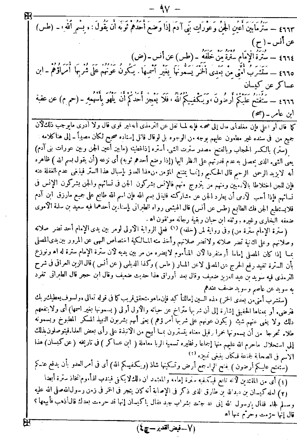 4663 - (ستر) بالكسر الحجاب وبالفتح مصدر سترت الشيء أستره إذا غطيته (ما بين أعين الجن وبين عورات بني آدم) يعني الشيء الذي يحصل به عدم قدرتهم على النظر إليها (إذا وضع أحدهم ثوبه) أي نزعه (أن يقول بسم الله) ظاهره أنه لا يزيد الرحمن الرحيم قال الحكيم: وإنما يمتنع المؤمن من هذا العدو بإسبال هذا الستر فينبغي عدم الغفلة عنه فإن للجن اختلاطا بالآدميين ومنهم من يتزوج منهم فالإنس يشركون الجن في نسائهم والجن يشركون الإنس في نسائهم فإذا أحب الآدمي أن يطرد الجن عن مشاركته فليقل بسم الله فإن اسم الله طابع على جميع ما رزق ابن آدم فلا يستطيع الجن فك الطابع