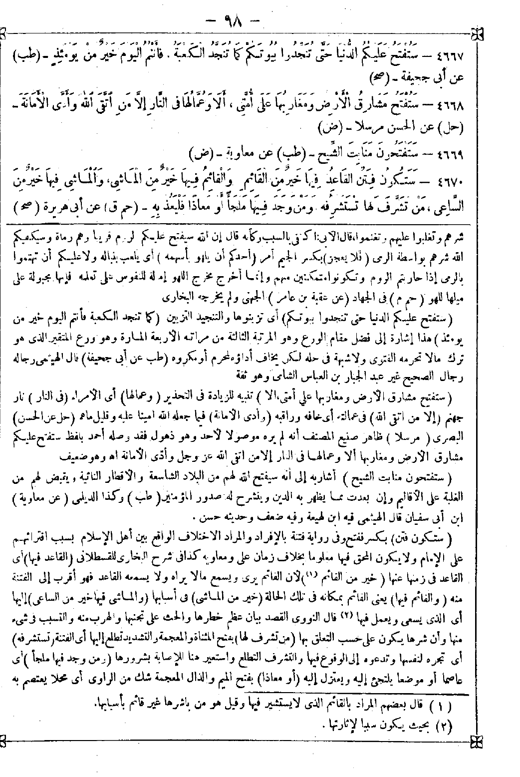 4670 - (ستكون فتن) بكسر ففتح وفي رواية فتنة بالإفراد والمراد الاختلاف الواقع بين أهل الإسلام بسبب افترائهم على الإمام ولا يكون المحق فيها معلوما بخلاف زمان علي ومعاوية كذا في شرح البخاري للقسطلاني (القاعد فيها) أي القاعد في زمنها عنها (خير من القائم (1)) لأن القائم يرى ويسمع ما لا يراه ولا يسمعه القاعد فهو أقرب إلى الفتنة منه (والقائم فيها) يعني القائم بمكانه في تلك الحالة (خير من الماشي) في أسبابها (والماشي فيها خير من الساعي) إليها أي الذي يسعى ويعمل فيها (2) قال النووي: القصد بيان عظم خطرها والحث على تجنبها والهرب منه والتسبب في شيء منها وأن شرها يكون على حسب التعلق بها (من تشرف لها) بفتح المثناة والمعجمة والتشديد تطلع إليها أي الفتنة (تستشرفه) أي تجره لنفسها وتدعوه إلى الوقوع فيها والتشرف التطلع واستعير هنا للإصابة بشرورها (ومن وجد فيها ملجأ) أي عاصما أو موضعا يلتجئ إليه ويعتزل إليه (أو معاذا) بفتح الميم والذال المعجمة شك من الراوي أي محلا يعتصم به -[99]- منها (فليعذ به) وفي رواية لمسلم فليستعذ أي ليذهب إليه ليعتزل فيه ومن لم يجد فليتخذ سيفا من خشب والمراد أن بعضهم أشد في ذلك من بعض فأعلاهم الساعي لإثارتها فالقائم بأسبابها وهو الماشي فالمباشر لها وهو القائم فمن يكون مع النظارة ولا يقاتل وهو القاعد فمن لم يفعل شيئا لكنه راض وهو القائم وهذا تحذير من الفتنة وحث على تجنبها وأن شرها يكون بحسب التعلق بها والمراد بها الاختلاف في طلب الملك حيث لم يعلم المحق من المبطل