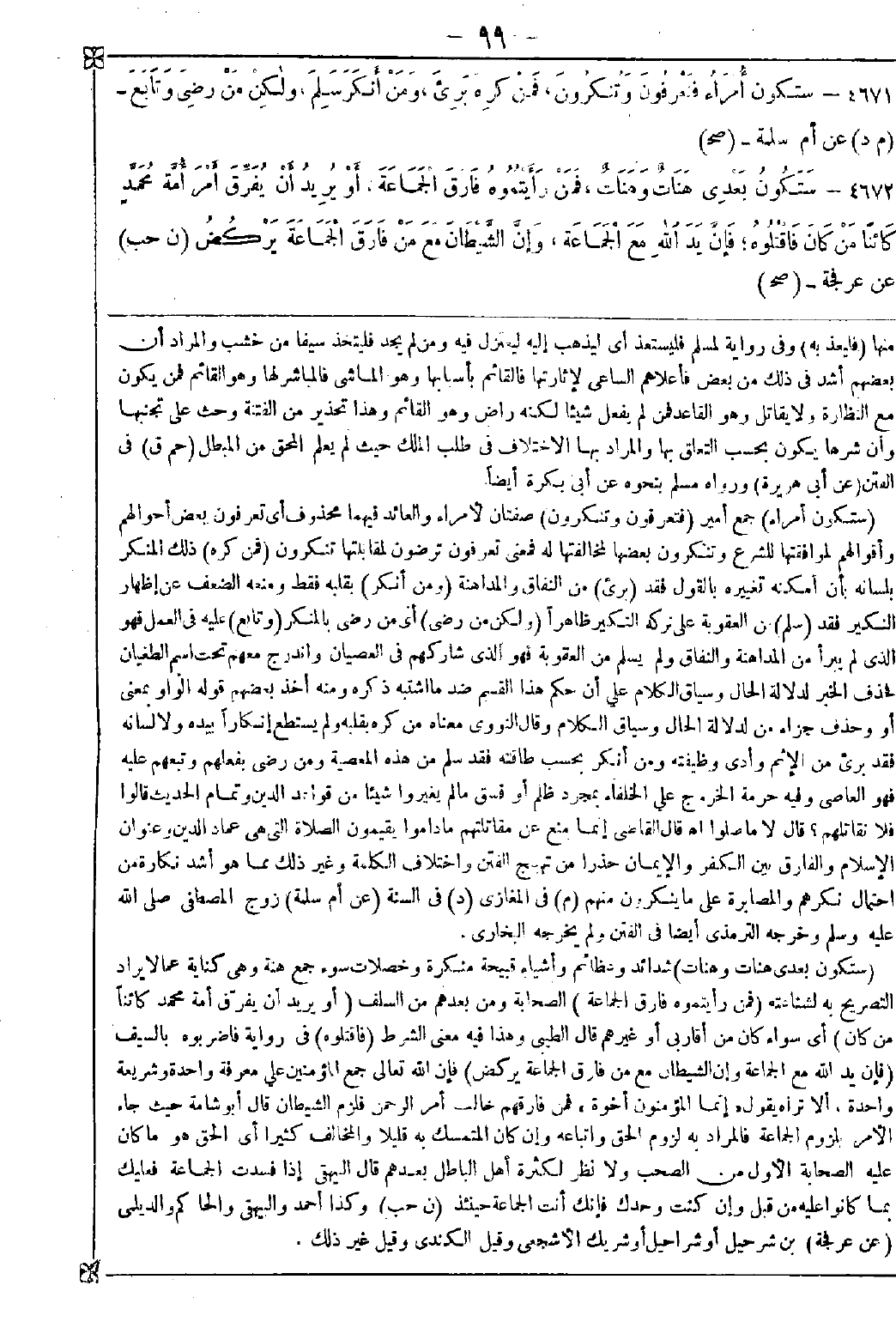 4671 - (ستكون أمراء) جمع أمير (فتعرفون وتنكرون) صفتان لأمراء والعائد فيهما محذوف أي تعرفون بعض أحوالهم وأقوالهم لموافقتها للشرع وتنكرون بعضها لمخالفتها له فمعنى تعرفون ترضون لمقابلتها تنكرون (فمن كره) ذلك المنكر بلسانه بأن أمكنه تغييره بالقول فقد (برئ) من النفاق والمداهنة (ومن أنكر) بقلبه فقط ومنعه الضعف عن إظهار النكير فقد (سلم) من العقوبة على تركه النكير ظاهرا (ولكن من رضي) أي من رضي بالمنكر (وتابع) عليه في العمل فهو الذي لم يبرأ من المداهنة والنفاق ولم يسلم من العقوبة فهو الذي شاركهم في العصيان واندرج معهم تحت اسم الطغيان فحذف الخبر لدلالة الحال وسياق الكلام على أن حكم هذا القسم ضد ما اشتبه ذكره ومنه أخذ بعضهم قوله الواو بمعنى أو وحذف جزاء من لدلالة الحال وسياق الكلام وقال النووي: معناه من كره بقلبه ولم يستطع إنكارا بيده ولا لسانه فقد برئ من الإثم وأدى وظيفته ومن أنكر بحسب طاقته فقد سلم من هذه المعصية ومن رضى بفعلهم وتبعهم عليه فهو العاصي وفيه حرمة الخروج على الخلفاء بمجرد ظلم أو فسق ما لم يغيروا شيئا من قواعد الدين وتمام الحديث قالوا: أفلا نقاتلهم؟ قال: لا ما صلوا اه. قال القاضي: إنما منع عن مقاتلتهم ما داموا يقيمون الصلاة التي هي عماد الدين وعنوان الإسلام والفارق بين الكفر والإيمان حذرا من تهيج الفتن واختلاف الكلمة وغير ذلك مما هو أشد نكارة من احتمال نكرهم والمصابرة على ما ينكرون منهم (م) في المغازي (د) في الستة (عن أم سلمة) زوج المصطفى صلى الله عليه وسلم وخرجه الترمذي أيضا في الفتن ولم يخرجه البخاري