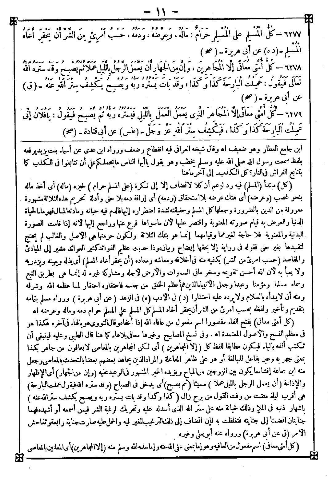 6278 - (كل أمتي معافى) بفتح الفاء مقصورا اسم مفعول من عافاه الله إذا أعفاه وقال النووي: هو بالهاء في آخره هكذا هو في معظم النسخ والأصول المعتمدة اه. وفي نسخ المصابيح وغيرها معافى بلا هاء كما هنا قال الطيبي: وعليه فينبغي أن تكتب ألفه بالياء فيكون مطابقا للفظ كل (إلا المجاهرين) أي لكن المجاهرين بالمعاصي لا يعافون من جاهر بكذا بمعنى جهر به وعبر بفاعل للمبالغة أو هو على ظاهر المفاعلة والمراد الذي يجاهد بعضهم بعضا بالتحدث بالمعاصي وجعل منه ابن جماعة إفشاء ما يكون بين الزوجين من المباح ويؤيده الخبر المشهور في الوعيد عليه (وإن من الجهار) أي الإظهار والإذاعة (أن يعمل الرجل بالليل عملا) مسيئا (ثم يصبح) أي يدخل في الصباح (وقد ستره الله فيقول عملت البارحة) هي أقرب ليلة مضت من وقت القول من برح زال (كذا وكذا وقد بات يستره ربه ويصبح يكشف ستر الله عنه) بإشهار ذنبه في الملأ وذلك خيانة منه على ستر الله الذي أسدله عليه وتحريك لرغبة الشر فيمن أسمعه أو أشهده فهما جنايتان انضمتا إلى جنايته فتغلظت به فإن انضاف إلى ذلك الترغيب للغير فيه والحمل عليه صارت جناية رابعة وتفاحش الأمر
