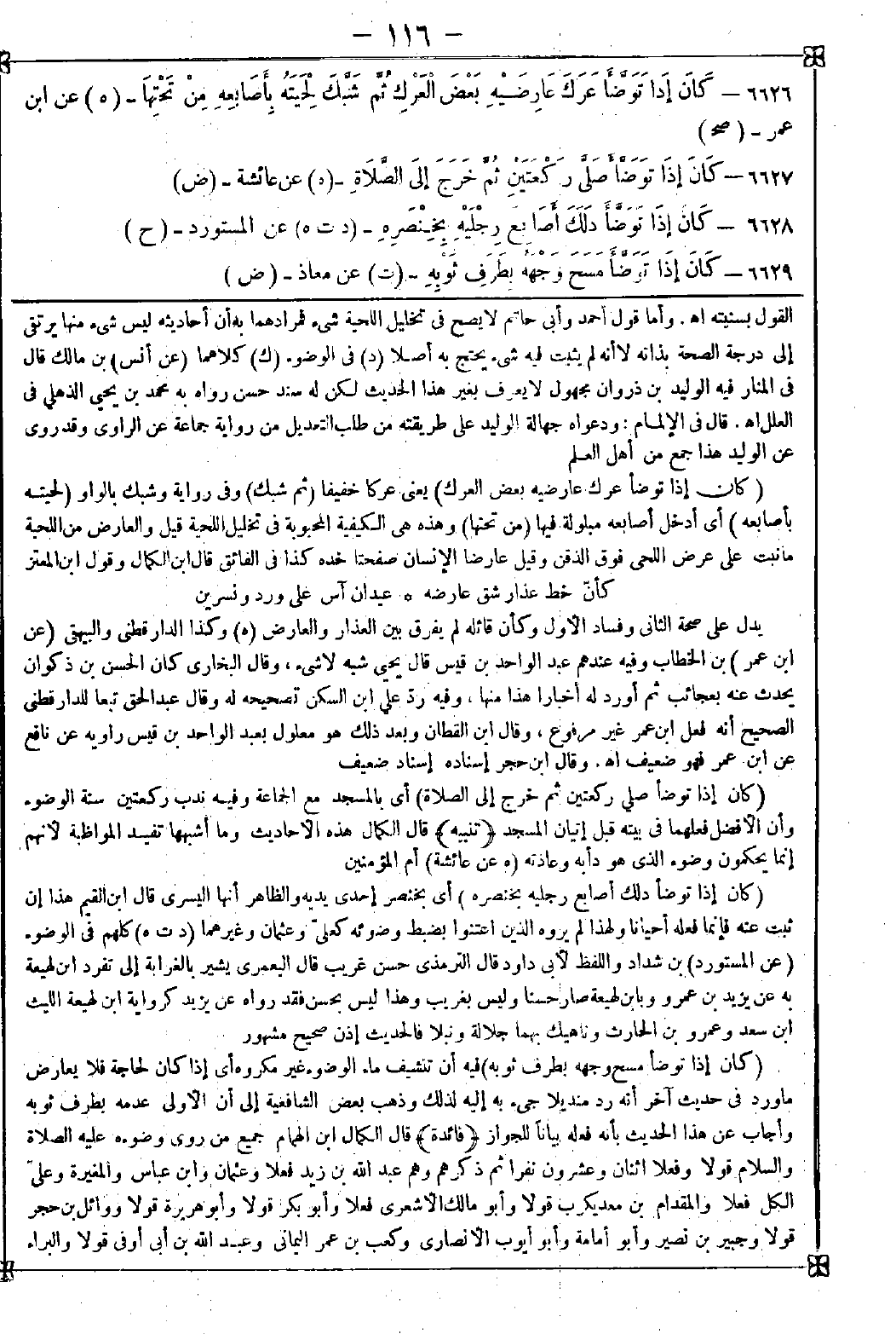 <فائدة> قال الكمال ابن الهمام: جميع من روى وضوءه عليه الصلاة والسلام قولا وفعلا اثنان وعشرون نفرا ثم ذكرهم وهم عبد الله بن زيد فعلا وعثمان وابن عباس والمغيرة وعلي الكل فعلا والمقدام بن معد يكرب قولا وأبو مالك الأشعري فعلا وأبو بكر قولا وأبو هريرة قولا وواثل بن حجر قولا وجبير بن نصير وأبو أمامة وأبو أيوب الأنصاري وكعب بن عمر اليماني وعبد الله بن أبي أوفى قولا والبراء -[117]- ابن عازب فعلا وأبو كامل قيس بن عائذ فعلا والربيع بن معوذ قولا وعائشة فعلا وعبد الله بن أبي أنيس فعلا وعمرو بن شعيب عن أبيه عن جده وليس في شيء منها ذكر التسمية إلا في حديث ضعيف ورواه الدارقطني عن عائشة