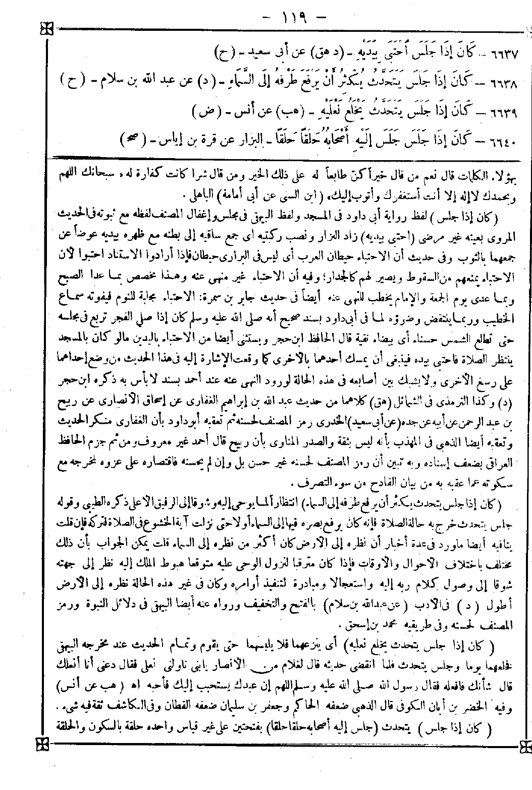 6637 - (كان إذا جلس) لفظ رواية أبي داود في المسجد ولفظ البيهقي في مجلس وإغفال المصنف لفظه مع ثبوته في الحديث المروي بعينه غير مرضي (احتبى يديه) زاد البزار ونصب ركبتيه أي جمع ساقيه إلى بطنه مع ظهره بيديه عوضا عن جمعهما بالثوب وفي حديث أن الاحتباء حيطان العرب أي ليس في البراري حيطان فإذا أرادوا الاستناد احتبوا لأن الاحتباء يمنعهم من السقوط ويصير لهم كالجدار وفيه أن الاحتباء غير منهي عنه وهذا مخصص بما عدا الصبح وبما عدا يوم الجمعة والإمام يخطب للنهي عنه أيضا في حديث جابر بن سمرة: الاحتباء مجلبة للنوم فيفوته سماع الخطيب وربما ينتقض وضوءه لما في أبي داود بسند صحيح أنه صلى الله عليه وسلم كان إذا صلى الفجر تربع في مجلسه حتى تطلع الشمس حسناء أي بيضاء نقية قال الحافظ ابن حجر: ويستثنى أيضا من الاحتباء باليدين ما لو كان بالمسجد ينتظر الصلاة فاحتبى بيده فينبغي أن يمسك أحدهما بالأخرى كما وقعت الإشارة إليه في هذا الحديث من وضع إحداهما على رسغ الأخرى ولا يشبك بين أصابعه في هذه الحالة لورود النهي عنه عند أحمد بسند لا بأس به ذكره ابن حجر