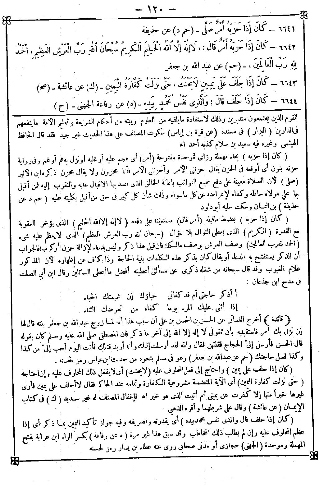 6642 - (كان إذا حزبه) بضبط ما قبله (أمر قال) مستعينا على دفعه (لا إله إلا الله الحليم) الذي يؤخر العقوبة مع القدرة (الكريم) الذي يعطي النوال بلا سؤال (سبحان الله رب العرش العظيم) الذي لا يعظم عليه شيء (الحمد لله رب العالمين) وصف العرش بوصف مالكه فإن قيل هذا ذكر وليس بدعاء لإزالة حزن أو كرب فالجواب أن الذكر يستفتح به الدعاء أو يقال كان يذكر هذه الكلمات بنية الحاجة وذا كاف عن إظهاره لأن المذكور علام الغيوب وقد قال سبحانه من شغله ذكري عن مسألتي أعطيته أفضل ما أعطي السائلين وقال ابن أبي الصلت في مدح ابن جذعان:
