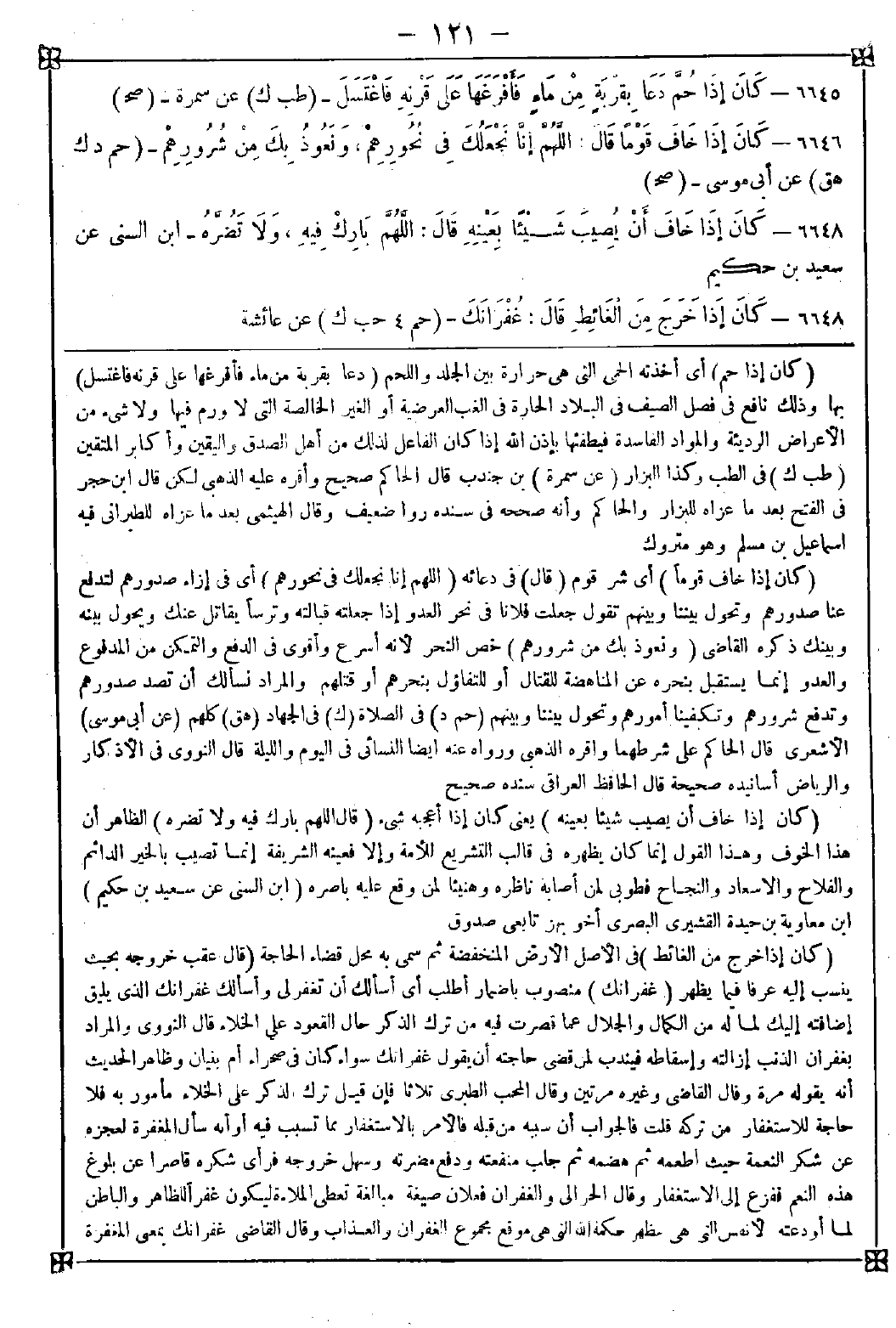 -[121]- 6645 - (كان إذا حم) أي أخذته الحمى التي هي حرارة بين الجلد واللحم (دعا بقربة من ماء فأفرغها على قرنه فاغتسل) بها وذلك نافع في فصل الصيف في البلاد الحارة في الغب العرضية أو الغير الخالصة التي لا ورم فيها ولا شيء من الأعراض الرديئة والمراد الفاسدة فيطفئها بإذن الله إذا كان الفاعل لذلك من أهل الصدق واليقين وأكابر المتقين