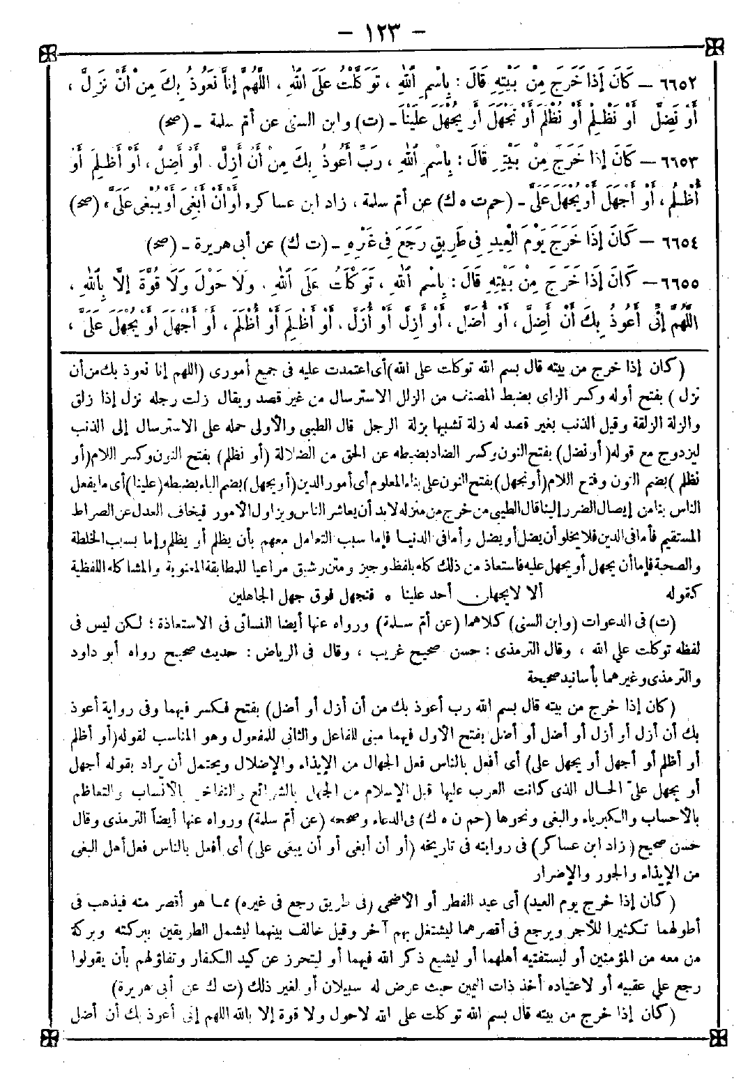 6655 - (كان إذا خرج من بيته قال بسم الله توكلت على الله لا حول ولا قوة إلا بالله اللهم إني أعوذ بك أن أضل -[124]- أو أضل أو أزل أو أزل أو أظلم أو أظلم أو أجهل أو يجهل علي أو أبغي أو يبغى علي) قال الطيبي: فإذ استعاذ العبد بالله باسمه المبارك فإنه يهديه ويرشده ويعينه في الأمور الدينية وإذا توكل على الله وفوض أمره إليه كفاه فيكون حسبه {ومن يتوكل على الله فهو حسبه} ومن قال لا حول ولا قوة إلا بالله كفاه الله شر الشيطان