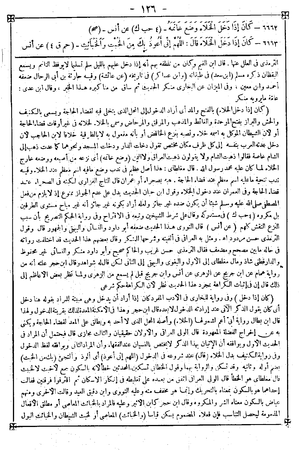 6663 - (كان إذا دخل) وفي رواية للبخاري في الأدب المفرد كان إذا أراد أن يدخل وهي مبينة للمراد بقوله هنا دخل أي كان يقول الذكر الآتي عند إرادته الدخول لا بعده قال ابن حجر: وهذا في الأمكنة المعدة لذلك بقرينة الدخول ولهذا قال ابن بطال: رواية أبي أعم لشمولها (الخلاء) وأصله المحل الذي لا أحد به ويطلق على المعد لقضاء الحاجة ويكنى به عن إخراج الفضلة المعهودة. قال الولي العراقي: والأولان حقيقيان والثالث مجازي قال: فيحتمل أن المراد في الحديث الأول ويوافقه أن الإتيان بهذا الذكر لا يختص بالنسيان عند الفقهاء وأن المراد الثاني ويوافقه لفظ الدخول وفي رواية الكنيف بدل الخلاء (قال) عند شروعه في الدخول (اللهم إني أعوذ) أي ألوذ وألتجئ (بك من الخبث) بضم أوله وثانيه وقد تسكن والرواية بهما وقول الخطابي تسكين المحدثين خطأ لأنه بالسكون جمع لأخبث لا لخبيث قال مغلطاي: هو الخطأ قال الولي العراقي: اتفق من بعده على تغليطه في إنكار الإسكان ثم افترقوا فرقتين فقالت إحداهما: هو بالسكون بمعناه بالتحريك وإنما هو مخفف منه وعليه النووي وابن دقيق العيد وقالت الأخرى ومنهم عياض: بالسكون معناه الشر والمكروه وقال ابن حجر كابن الأثير: وعليه فالمراد بالخبائث المعاصي أو مطلق الأفعال المذمومة ليحصل التناسب فإن فعلاء المضموم يسكن قياسا (والخبائث) المعاصي أو لخبث الشيطان والخبائث البول -[127]- والغائط وأصل الخبث في كلامهم المكروه فإن كان من الكلام فهو الشتم أو من الملل فهو الكفر أو من الطعام فالحرام أو من الشراب فالضار اه. وفائدة قوله هذا مع كونه معصوما من الشياطين وغيرهم التشريع لأمته والاستنان بسنته أو لزوم الخضوع لربه وإظهار العبودية له قال الفاكهي: والظاهر أنه كان يجهر بهذه الاستعاذة إذ لو لم يسمع لم ينقل وإخباره عن نفسه بها بعيد وفيه استحباب هذا الذكر عند إرادة قضاء الحاجة وهو مجمع عليه كما حكاه النووي. قال ابن العربي: وإنما شرعت الاستعاذة في هذا المحل لأنه محل خلوة والشيطان يتسلط فيها ما لا يتسلط في غيرها ولأنه موضع قدر ينزه الله عن جريان ذكره على اللسان فيه والذكر مبعد للشيطان فإذا انقطع الذكر اغتنم تلك الغفلة فشرع تقديم الاستعاذة للعصمة منه