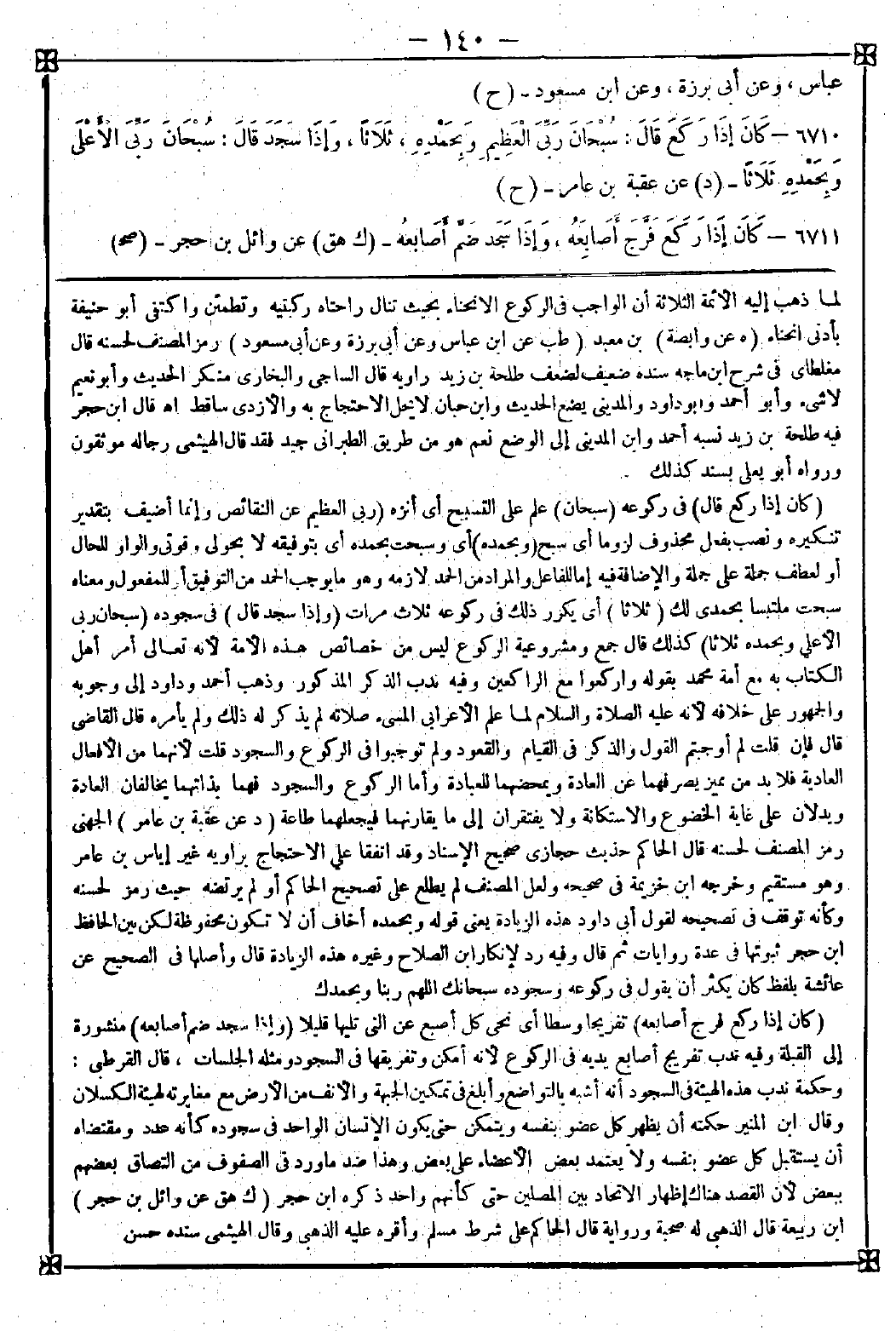 6710 - (كان إذا ركع قال) في ركوعه (سبحان) علم على التسبيح أي أنزه (ربي العظيم) عن النقائص وإنما أضيف بتقدير تنكيره ونصب بفعل محذوف لزوما أي سبح (وبحمده) أي وسبحت بحمده أي بتوفيقه لا بحولي وقوتي والواو للحال أو لعطف جملة على جملة والإضافة فيه إما للفاعل والمراد من الحمد لازمه وهو ما يوجب الحمد من التوفيق أو للمفعول ومعناه سبحت ملتبسا بحمدي لك (ثلاثا) أي يكرر ذلك في ركوعه ثلاث مرات (وإذا سجد قال) في سجوده (سبحان ربي الأعلى وبحمده ثلاثا) كذلك قال جمع ومشروعية الركوع ليس من خصائص هذه الأمة لأنه تعالى أمر أهل الكتاب به مع أمة محمد بقوله {واركعوا مع الراكعين} وفيه ندب الذكر المذكور وذهب أحمد وداود إلى وجوبه والجمهور على خلافه لأنه عليه الصلاة والسلام لما علم الأعرابي المسيء صلاته لم يذكر له ذلك ولم يأمره قال القاضي: قال فإن قلت لم أوجبتم القول والذكر في القيام والقعود ولم توجبوا في الركوع والسجود قلت لأنهما من الأفعال العادية فلا بد من مميز يصرفهما عن العادة ويمحضهما وأما الركوع والسجود فهما بذاتهما يخالفان العادة ويدلان على غاية الخضوع والاستكانة ولا يفتقران إلى ما يقارنهما فيجعلهما طاعة