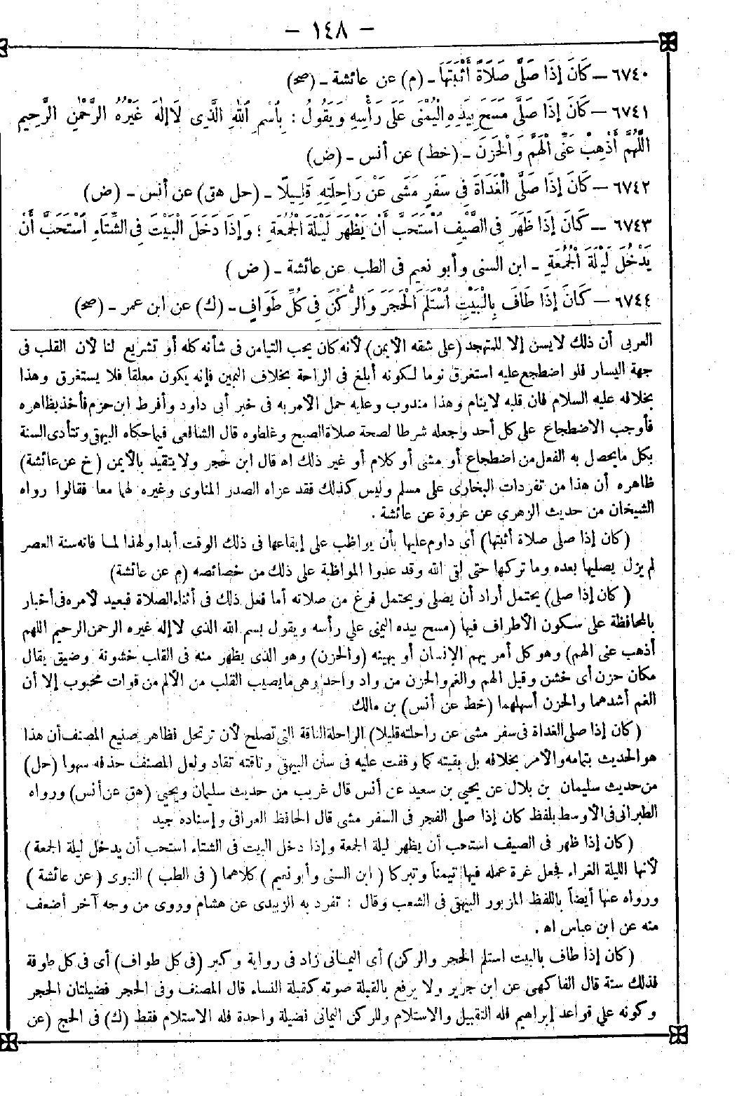6740 - (كان إذا صلى صلاة أثبتها) أي داوم عليها بأن يواظب على إيقاعها في ذلك الوقت أبدا ولهذا لما فاته سنة العصر لم يزل يصليها بعده وما تركها حتى لقي الله وقد عدوا المواظبة على ذلك من خصائصه