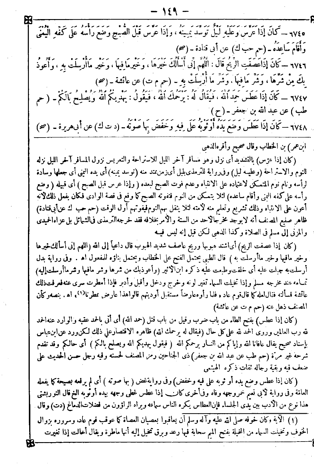 6745 - (كان إذا عرس) بالتشديد أي نزل وهو مسافر آخر الليل للاستراحة والتعريس نزول المسافر آخر الليل نزله للنوم والاستراحة (وعليه ليل) وفي رواية للترمذي بليل أي زمن ممتد منه (توسد يمينه) أي يده اليمنى أي جعلها وسادة لرأسه ونام نوم المتمكن لاعتماده على الانتباه وعدم فوت الصبح لبعده (وإذا عرس قبل الصبح) أي قبيله (وضع رأسه على كفه اليمنى وأقام ساعده) لئلا يتمكن من النوم فتفوته الصبح كما وقع في قصة الوادي فكان يفعل ذلك لأنه أعون على الانتباه وذلك تشريع وتعليم منه لأمته لئلا يثقل بهم النوم فيفوتهم أول الوقت