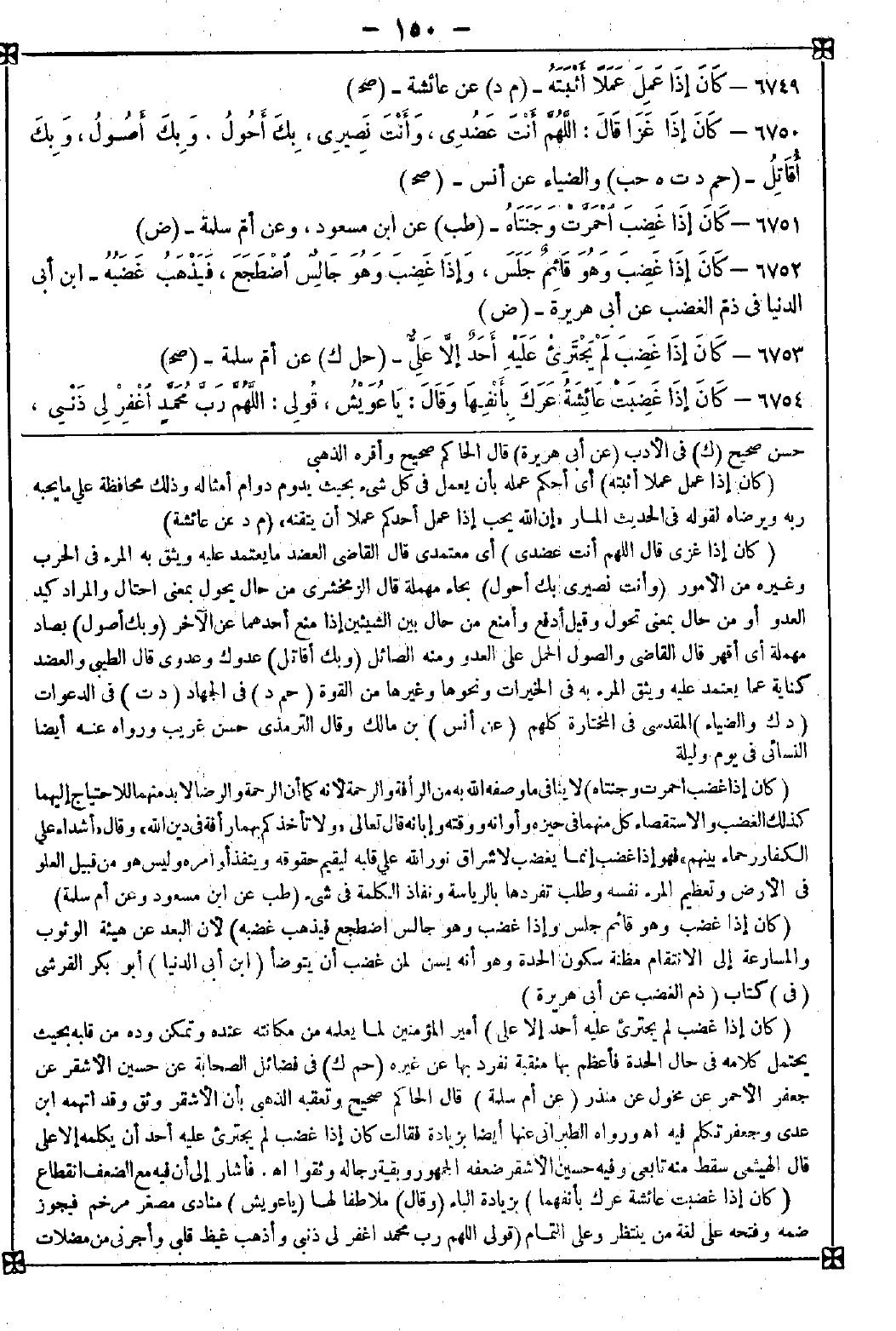 6751 - (كان إذا غضب احمرت وجنتاه) لا ينافي ما وصفه الله به من الرأفة والرحمة لأنه كما أن الرحمة والرضا لا بد منهما للاحتياج إليهما كذلك الغضب والاستقصاء كل منهما في حيزه وأوانه ووقته وإبانه قال تعالى {ولا تأخذكم بهما رأفة في دين الله} وقال {أشداء على الكفار رحماء بينهم} فهو إذا غضب إنما يغضب لإشراق نور الله على قلبه ليقيم حقوقه وينفذ أوامره وليس هو من قبيل العلو في الأرض وتعظيم المرء نفسه وطلب تفردها بالرياسة ونفاذ الكلمة في شيء