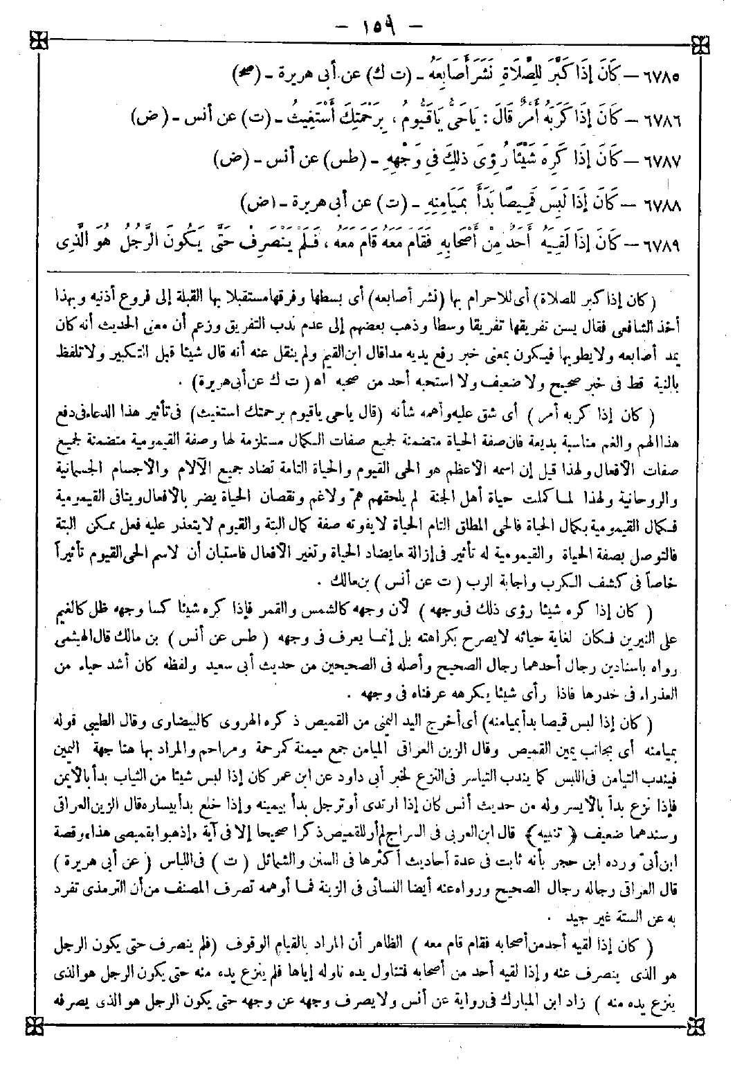 6789 - (كان إذا لقيه أحد من أصحابه فقام قام معه) الظاهر أن المراد بالقيام الوقوف (فلم ينصرف حتى يكون الرجل هو الذي ينصرف عنه وإذا لقيه أحد من أصحابه فتناول يده ناوله إياها فلم ينزع يده منه حتى يكون الرجل هو الذي ينزع يده منه) زاد ابن المبارك في رواية عن أنس ولا يصرف وجهه عن وجهه حتى يكون الرجل هو الذي يصرفه -[160]- (وإذا لقي أحدا من أصحابه فتناول أذنه ناوله إياها ثم لم ينزعها عنه حتى يكون الرجل هو الذي ينزعها عنه) الظاهر أن المراد بمناولة الأذن أن يريد أحد من أصحابه أن يسر إليه حديثا فيقرب فمه من أذنه يسر إليه فكان لا ينحي أذنه عن فمه حتى يفرغ الرجل حديثه على الوجه الأكمل وهذا من أعظم الأدلة على محاسن أخلاقه وكماله صلى الله عليه وسلم كيف وهو سيد المتواضعين وهو القائل وخالق الناس بخلق حسن