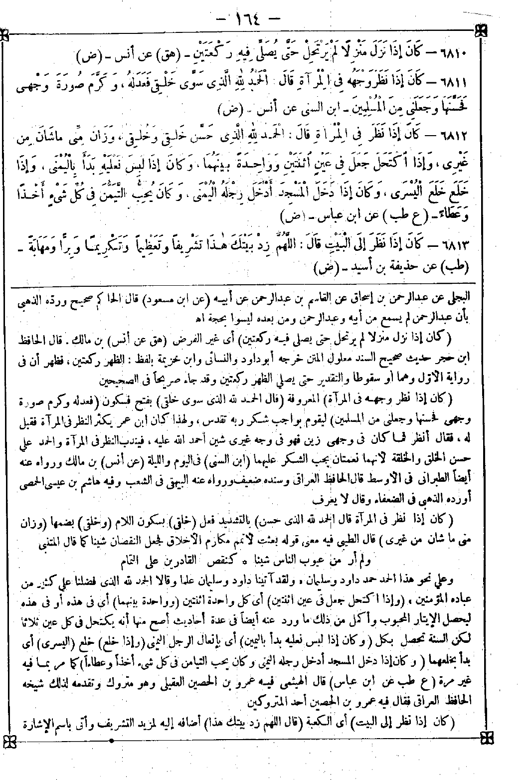 6811 - (كان إذا نظر وجهه في المرآة) المعروفة (قال الحمد لله الذي سوى خلقي) بفتح فسكون (فعدله وكرم صورة وجهي فحسنها وجعلني من المسلمين) ليقوم بواجب شكر ربه تقدس ولهذا كان ابن عمر يكثر النظر في المرآة فقيل له فقال أنظر فما كان في وجهي زين فهو في وجه غيري شين أحمد الله عليه فيندب النظر في المرآة والحمد على حسن الخلق والخلقة لأنهما نعمتان يجب الشكر عليهما