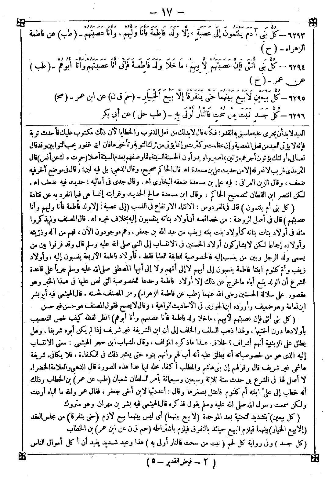 6294 - (كل بني أنثى فإن عصبتهم لأبيهم ما خلا ولد فاطمة فأنا عصبتهم وأنا أبوهم) انظر لفظه كيف خص التعصيب بأولادها دون أختيها ولهذا ذهب السلف والخلف إلى أن ابن الشريفة غير شريف إذا لم يكن أبوه شريفا وهل يطلق على الزينبية أنهم أشراف؟ خلاف هذا ما ذكره المؤلف وقال الشهاب ابن حجر الهيثمي: معنى الانتساب إليه الذي هو من خصوصياته أنه يطلق عليه أنه أب لهم وأنهم بنوه حتى يعتبر ذلك في الكفاءة فلا يكافئ شريفة هاشمي غير شريف قال: وقولهم إن بني هاشم والمطلب أكفاء محله فيما عدا هذه الصورة قال الذهبي: والعلامة الخضراء لا أصل لها في الشرع بل حدث سنة ثلاثة وسبعين وسبع مئة بأمر السلطان شعبان