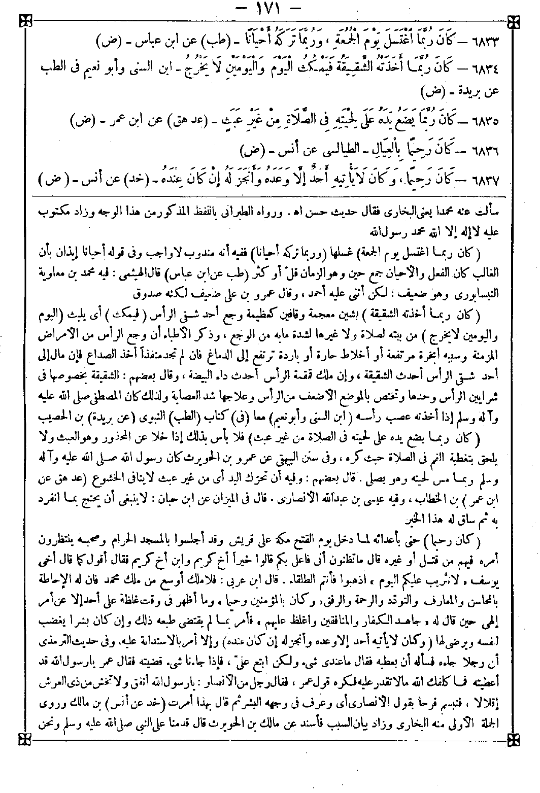 6835 - (كان ربما يضع يده على لحيته في الصلاة من غير عبث) فلا بأس بذلك إلا خلا عن المحذور وهو العبث ولا يلحق بتغطية الفم في الصلاة حيث كره وفي سنن البيهقي عن عمرو بن الحويرث كان رسول الله صلى الله عليه وآله وسلم ربما مس لحيته وهو يصلي. قال بعضهم: وفيه أن تحرك اليد أي من غير عبث لا ينافي الخشوع