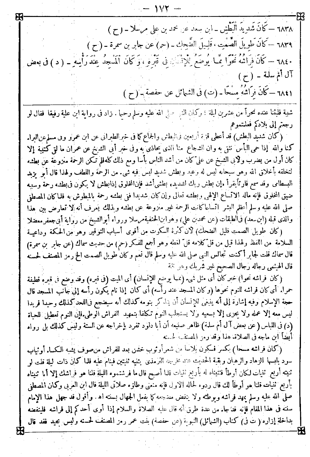 6840 - (كان فراشه نحوا) خبر كان أي مثل شيء (مما يوضع للإنسان) أي الميت (في قبره) وقد وضع في قبره قطيفة حمراء أي كان فراشه للنوم نحوها (وكان المسجد عند رأسه) أي كان إذا نام يكون رأسه إلى جانب المسجد. قال حجة الإسلام: وفيه إشارة إلى أنه ينبغي للإنسان أن يتذكر بنومه كذلك أنه سيضجع في اللحد كذلك وحيدا فريدا ليس معه إلا عمله ولا يجزى إلا بسعيه ولا يستجلب النوم تكلفا بتمهيد الفراش الوطئ فإن النوم تعطيل للحياة