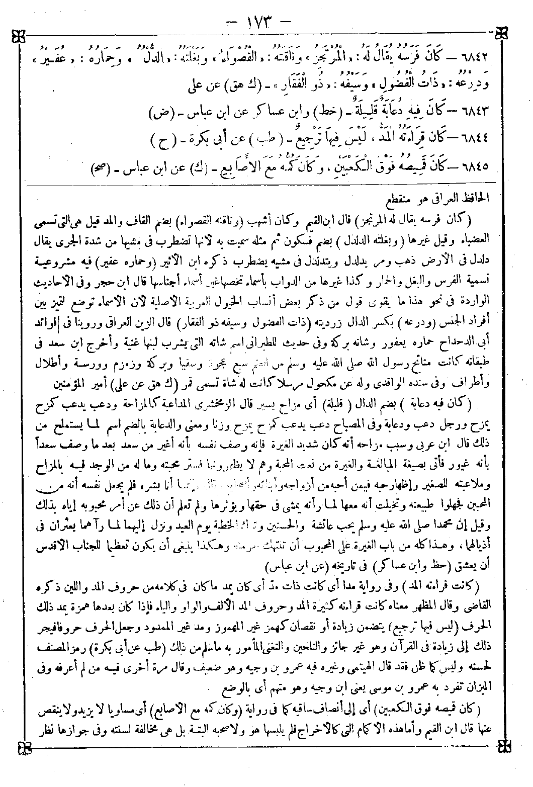 6842 - (كان فرسه يقال له المرتجز) قال ابن القيم: وكان أشهب (وناقته القصواء) بضم القاف والمد قيل هي التي تسمى العضباء وقيل غيرها (وبغلته الدلدل) بضم فسكون ثم مثله سميت به لأنها تضطرب في مشيها من شدة الجري يقال دلدل في الأرض ذهب ومر يدلدل ويتدلدل في مشيه يضطرب ذكره ابن الأثير (وحماره عفير) فيه مشروعية تسمية الفرس والبغل والحمار وكذا غيرها من الدواب بأسماء تخصها غير أسماء أجناسها قال ابن حجر: وفي الأحاديث الواردة في نحو هذا ما يقوي قول من ذكر بعض أنساب الخيول العربية الأصيلة لأن الأسماء توضع لتميز بين أفراد الجنس (ودرعه) بكسر الدال زرديته (ذات العضول وسيفه ذو الفقار) قال الزين العراقي: وروينا في فوائد أبي الدحداح حماره يعفور وشاته بركة وفي حديث للطبراني اسم شاته التي يشرب لبنها غنية وأخرج ابن سعد في طبقاته كانت منائح رسول الله صلى الله عليه وسلم من الغنم سبع عجوة وسقيا وبركة وزمزم وورسة وأطلال وأطراف وفي سنده الواقدي وله عن مكحول مرسلا كانت له شاة تسمى قمر