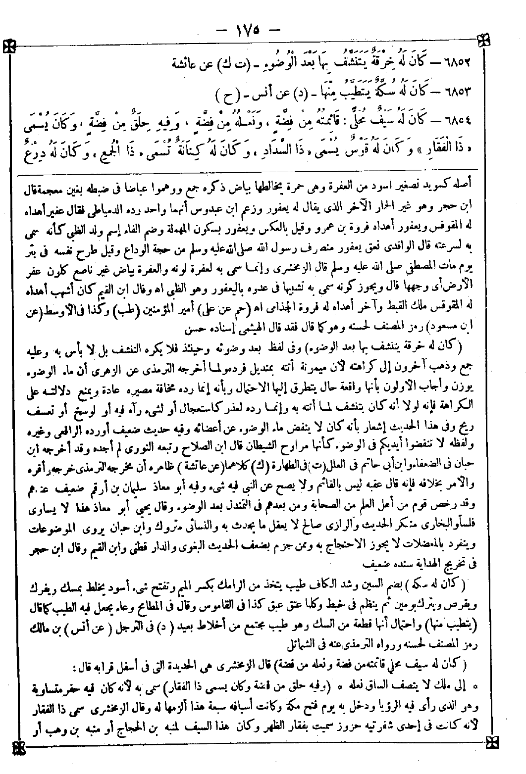 6854 - (كان له سيف محلى قائمته من فضة ونعله من فضة) قال الزمخشري: هي الحديدة التي في أسفل قرابه قال:. . . إلى ملك لا ينصف الساق نعله. . . (وفيه حلق من فضة وكان يسمى ذا الفقار) سمي به لأنه كان فيه حفر متساوية وهو الذي رأى فيه الرؤيا ودخل به يوم فتح مكة وكانت أسيافه سبعة هذا ألزمها له وقال الزمخشري: سمي ذا الفقار لأنه كانت في إحدى شفرتيه حزوز سميت بفقار الظهر وكان هذا السيف لمنبه بن الحجاج أو منبه بن وهب أو -[176]- العاص بن منبه أو الحجاج بن عكاظ أو غيرهم ثم صار عند الخلفاء العباسيين. قال الأصمعي: دخلت على الرشيد فقال: أريكم سيف رسول الله صلى الله عليه وسلم ذا الفقار قلنا: نعم فجاء به فما رأيت سيفا أحسن منه إذا نصب لم ير فيه شيء وإذا بطح عد فيه سبع فقر وإذا صفيحته يمانية يحار الطرف فيه من حسنه وقال قاسم في الدلائل: إن ذلك كان يرى في رونقه شبيها بفقار الحية فإذا التمس لم يوجد (وكان له قوس تسمى) بمثناة فوقية وسكون السين بضبط المصنف وكذا ما يأتي (ذا السداد) قال ابن القيم: وكان له قسي هذا أحدها (وكان له كنانة تسمى ذا الجمع) بضم الجيم بضبط المصنف الكنانة بكسر الكاف جعبة السهام وبها سميت القبيلة (وكان له درع) بكسر الدال وسكون الراء المهملتين (موشحة بنحاس تسمى ذات الفضول) وهي التي رهنها عند أبي الشحم اليهودي وكان له سبعة دروع هذه أحدها (وكان له حربة تسمى النبعاء) بنون مفتوحة فموحدة ساكنة فعين مهملة وقيل بباء موحدة ثم نون ساكنة فعين مهملة شجر يتخذ القسي منه قال ابن القيم: وكان له حربة أخرى كبيرة تدعى البيضاء (وكان له مجن) بكسر الميم ترس سمي به لأن صاحبه يستتر به وجمعه مجان ككتاب (يسمى الذقن وكان له فرس أشقر يسمى المرتجز) لحسن صهيله ذكره الزمخشري قال النووي في التهذيب: وهو الذي اشتراه من الأعرابي الذي شهد عليه خزيمة بن ثابت (وكان له فرس أدهم) أي أسود (يسمى السكب) بفتح فسكون قال الزمخشري: سمي به لأنه كثير الجري وأصل السكب الصب فاستعير لشدة الجري وقيل هو بالتحريك سمي بالسكب وهو شقائق النعمان قال الشاعر:. . . كالسكب المحمر فوق الرابية. . . وقيل بالتخفيف لكثرة سائله وهو ذنبه قيل وهذا أول فرس ملكه كما في تهذيب النووي قال: كان أغر محجلا طلق اليمين وهو أول فرس غزا عليه (وكان له سرح يسمى الداج وكان له بغلة شهباء تسمى دلدل) بضم الدالين المهملتين أهداها له يوحنا ملك أيلة وظاهر البخاري أنه أهداها له في غزوة حنين وقد كانت هذه البغلة عند رسول الله صلى الله عليه وسلم قبل ذلك قال القاضي: ولم يرو أنه كانت له بغلة غيرها ذكره النووي وتعقبه الجلال البلقيني بأن البغلة التي كان عليها يوم حنين غير هذه ففي مسلم أنه كان على بغلة بيضاء أهداها له الجذامي قال: وفيما قاله القاضي نظر فقد قيل كان له دلدل وفضة وهي التي أهداها ابن العلماء والأيلية وبغلة أهداها له كسرى وأخرى من دومة الجندل وأخرى من النجاشي كذا في سيرة مغلطاي وفي الهدي كان له من البغال دلدل وكانت شهباء أهداها له المقوقس وأخرى اسمها فضة أهداها له صاحب دومة الجندل (وكانت له ناقة تسمى القصواء) بفتح القاف والمد وقيل بضمها والقصواء قبل وهي التي هاجر عليها والقصواء الناقة التي قطع طرف أذنها وكل ما قطع من الأذن فهو جذع فإذا بلغ الربع فهي قصوى فإذا جاوز فهو عضب فإذا استوصلت فهو صلم قال ابن الأثير: ولم تكن ناقة النبي صلى الله عليه وسلم قصوى وإنما هو لقب لها لقيت به لأنها كانت غاية في الجري وآخر كل شيء أقصاه وجاء في خبر أن له ناقة تسمى العضباء وناقة تسمى الجذعاء فيحتمل أن كل واحدة صفة ناقة مفردة ويحتمل كون الكل صفة ناقة واحدة فيسمى كل واحد منهم بما يخيل فيها (وكان له حمار يسمى يعفور وكان له بساط) كذا بخط المصنف فما في نسخ من أنه فسطاط تصحيف عليه -[177]- (يسمى الكز) بزاي معجمة بضبط المصنف (وكان له عنزة) بالتحريك حربة (تسمى النمر وكان له ركوة تسمى الصادر) سميت به لأنه يصدر عنها بالري ذكره ابن الأثير (وكان له مرآة تسمى المدلة وكان له مقراض) بكسر الميم وهو المسمى الآن بالمقص (يسمى الجامع وكان له قضيب) فعيل
