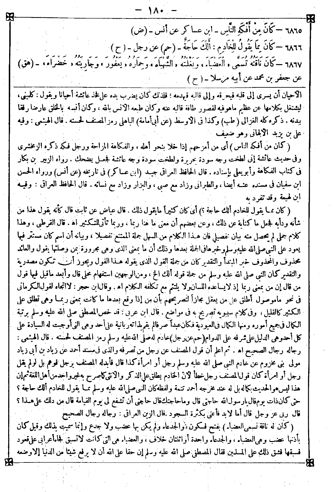 6865 - (كان من أفكه الناس) أي من أمزحهم إذا خلا بنحو أهله والفكاهة المزاحة ورجل فكه ذكره الزمخشري وفي حديث عائشة إني لطخت وجه سودة بحريرة ولطخت سودة وجه عائشة فجعل يضحك. رواه الزبير بن بكار في كتاب الفكاهة وأبو يعلى بإسناده. قال الحافظ العراقي: جيد
