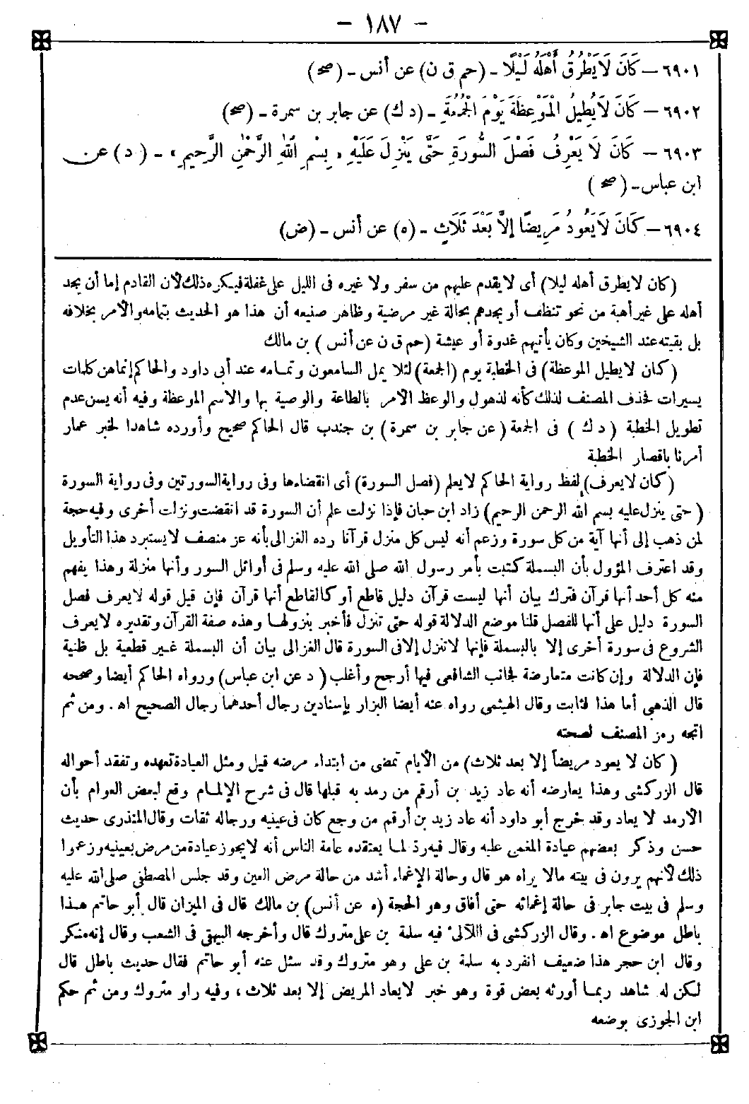 6904 - (كان لا يعود مريضا إلا بعد ثلاث) من الأيام تمضي من ابتداء مرضه قيل ومثل العيادة تعهده وتفقد أحواله قال الزركشي: وهذا يعارضه أنه عاد زيد بن أرقم من رمد به قبلها قال في شرح الإلمام: وقع لبعض العوام بأن الأرمد لا يعاد وقد خرج أبو داود أنه عاد زيد بن أرقم من وجع كان في عينيه ورجاله ثقات وقال المنذري: حديث حسن وذكر بعضهم عيادة المغمى عليه وقال: فيه رد لما يعتقده عامة الناس أنه لا يجوز عيادة من مرض بعينيه وزعموا ذلك لأنهم يرون في بيته ما يراه هو قال: وحالة الإغماء أشد من حالة مرض العين وقد جلس المصطفى صلى الله عليه وسلم في بيت جابر في حالة إغمائه حتى أفاق وهو الحجة