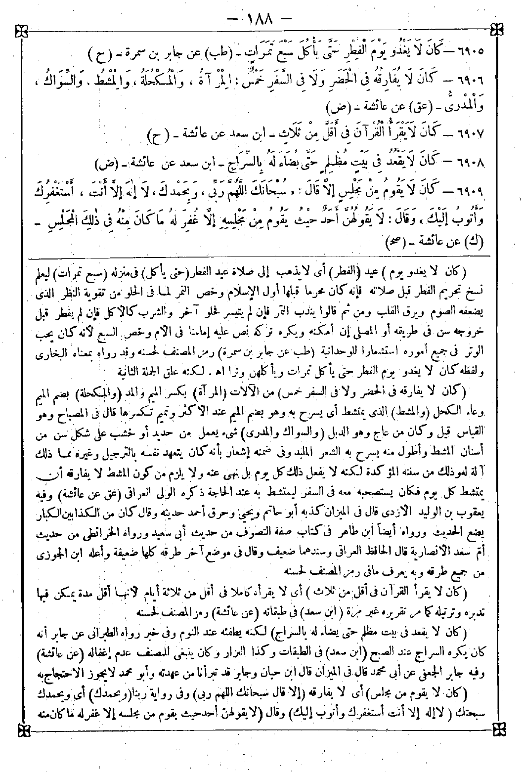 6908 - (كان لا يقعد في بيت مظلم حتى يضاء له بالسراج) لكنه يطفئه عند النوم وفي خبر رواه الطبراني عن جابر أنه كان يكره السراج عند الصبح