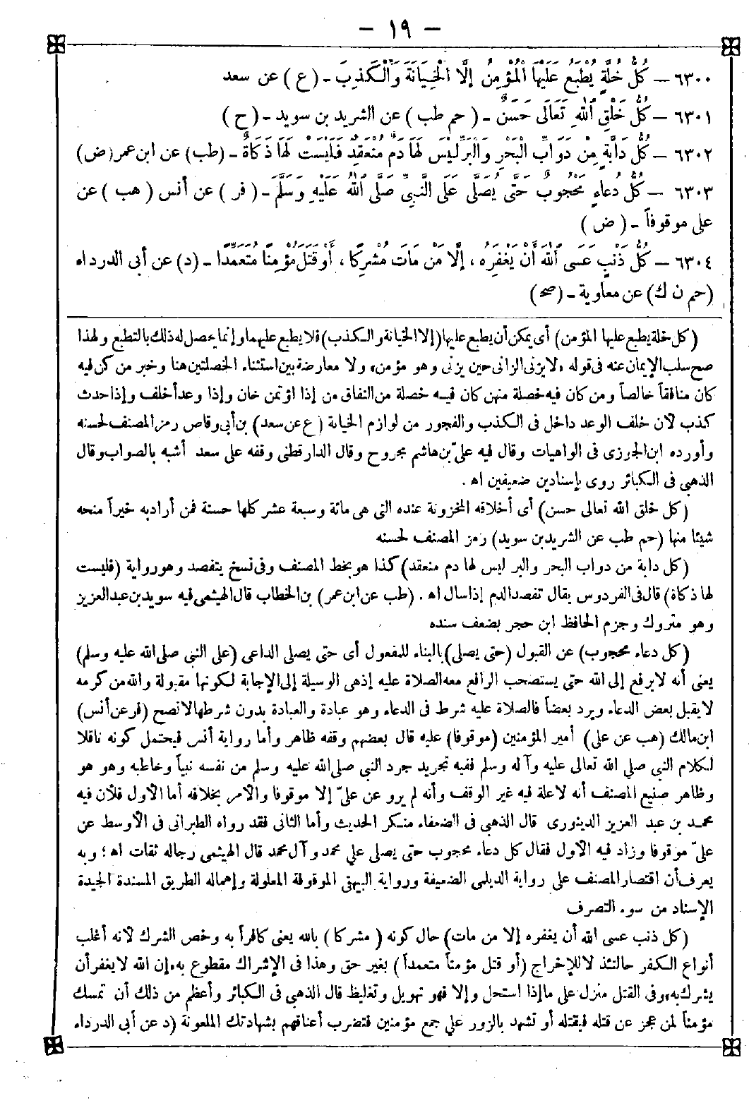 -[19]- 6300 - (كل خلة يطبع عليها المؤمن) أي يمكن أن يطبع عليها (إلا الخيانة والكذب) فلا يطبع عليهما وإنما يحصل له ذلك بالتطبع ولهذا صح سلب الإيمان عنه في قوله " لا يزني الزاني حين يزني وهو مؤمن " ولا معارضة بين استثناء الخصلتين هنا وخبر من كن فيه كان منافقا خالصا ومن كان فيه خصلة منهن كان فيه خصلة من النفاق من إذا أؤتمن خان وإذا وعد أخلف وإذا حدث كذب لأن خلف الوعد داخل في الكذب والفجور من لوازم الخيانة