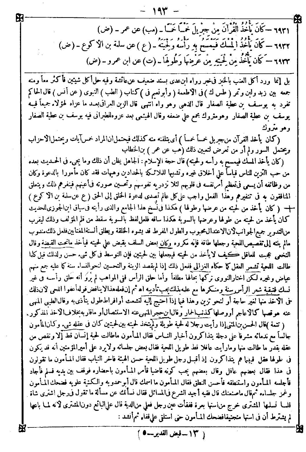 6933 - (كان يأخذ من لحيته من عرضها وطولها) هكذا في نسخ هذا الجامع والذي رأيته في سياق ابن الجوزي للحديث كان يأخذ من لحيته من طولها وعرضها بالسوية هكذا ساقه فلعل لفظ بالسوية سقط من قلم المؤلف وذلك ليقرب من التدوير جميع الجوانب لأن الاعتدال محبوب والطول المفرط قد يشوه الخلقة ويطلق ألسنة المغتابين فلعل ذلك مندوب ما لم ينته إلى تقصيص اللحية وجعلها طاقة فإنه مكروه وكان بعض السلف يقبض على لحيته فيأخذ ما تحت القبضة وقال النخعي: عجبت للعاقل كيف لا يأخذ من لحيته فيجعلها بين لحيتين فإن التوسط في كل شيء حسن ولذلك قيل كلما طالت اللحية تشمر العقل كما حكاه الغزالي ففعل ذلك إذا لم يقصد الزينة والتحسين لنحو النساء سنة كما عليه جمع منهم عياض وغيره لكن اختار النووي تركها بحالها مطلقا وأما حلق الرأس ففي المواهب لم يرو أنه حلق رأسه في غير نسك فتبقية شعر الرأس سنة ومنكرها مع علمه بذلك يجب تأديبه اه. ثم إن فعله هذا لا يناقض قوله أعفوا اللحى لأن ذلك في الأخذ منها لغير حاجة أو لنحو تزين وهذا فيما إذا احتيج إليه لتشعث أو إفراط يتأذى به وقال الطيبي: المنهي عنه هو قصها كالأعاجم أو وصلها كذنب الحمار وقال ابن حجر: المنهي عنه الاستئصال أو ما قاربه بخلاف الأخذ المذكور
