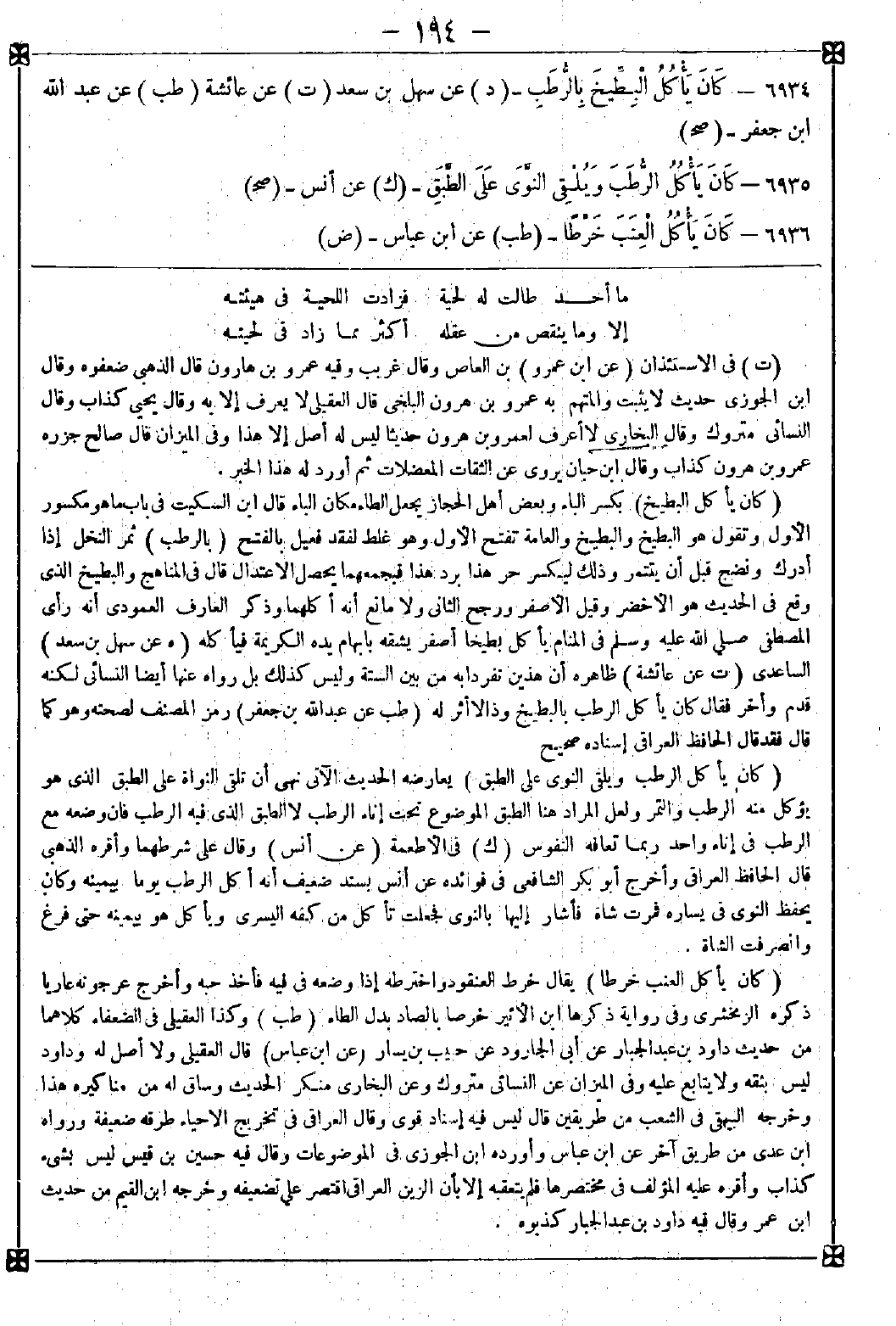 6935 - (كان يأكل الرطب ويلقي النوى على الطبق) يعارضه الحديث الآتي نهى أن تلقى النواة على الطبق الذي يؤكل منه الرطب والتمر ولعل المراد هنا الطبق الموضوع تحت إناء الرطب لا الطبق الذي فيه الرطب فإن وضعه مع الرطب في إناء واحد ربما تعافه النفوس