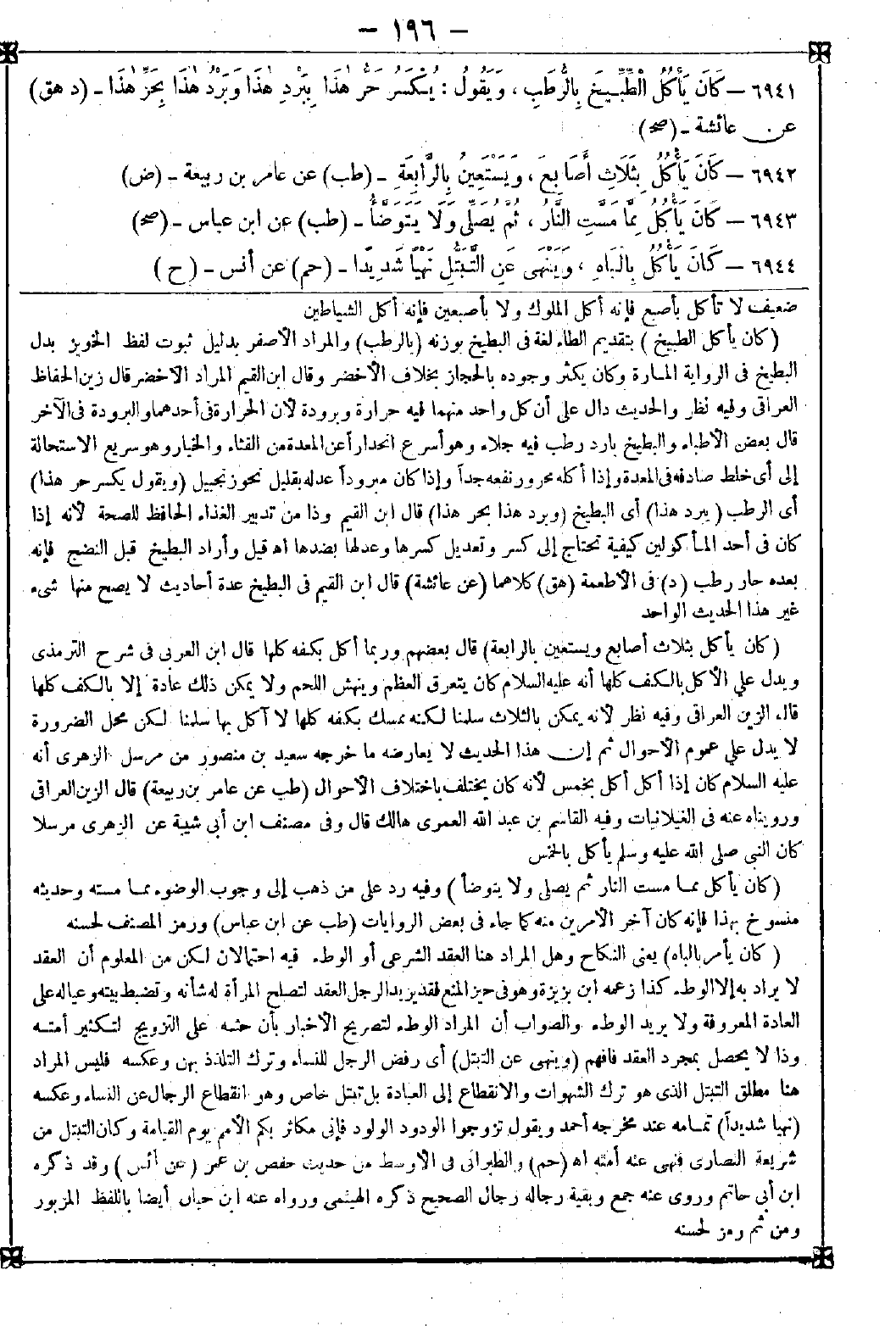 6942 - (كان يأكل بثلاث أصابع ويستعين بالرابعة) قال بعضهم: وربما أكل بكفه كلها قال ابن العربي في شرح الترمذي: ويدل على الأكل بالكف كلها أنه عليه السلام كان يتعرق العظم وينهش اللحم ولا يمكن ذلك عادة إلا بالكف كلها قال الزين العراقي: وفيه نظر لأنه يمكن بالثلاث سلمنا لكنه ممسك بكفه كلها لا آكل بها سلمنا لكن محل الضرورة لا يدل على عموم الأحوال ثم إن هذا الحديث لا يعارضه ما خرجه سعيد بن منصور من مرسل الزهري أنه عليه السلام كان إذا أكل أكل بخمس لأنه كان يختلف باختلاف الأحوال