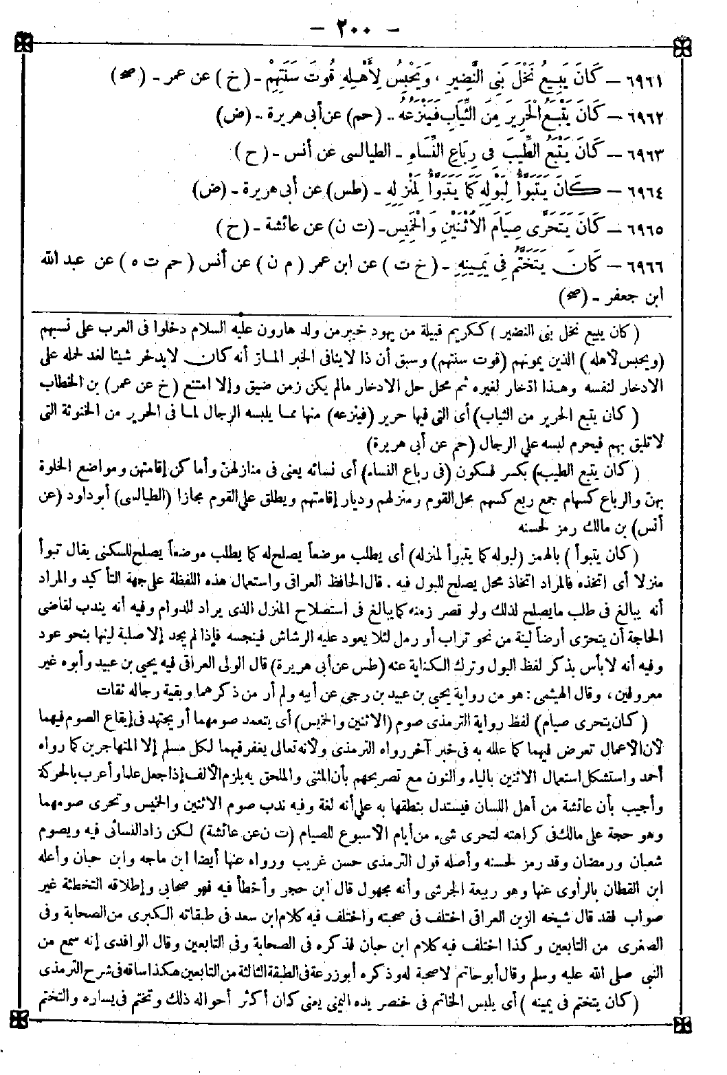-[200]- 6961 - (كان يبيع نخل بني النضير) ككريم قبيلة من يهود خيبر من ولد هارون عليه السلام دخلوا في العرب على نسبهم (ويحبس لأهله) الذين يمونهم (قوت سنتهم) وسبق أن ذا لا ينافي الخبر الماز أنه كان لا يدخر شيئا لغد لحمله على الادخار لنفسه وهذا ادخار لغيره ثم محل حل الادخار ما لم يكن زمن ضيق وإلا امتنع