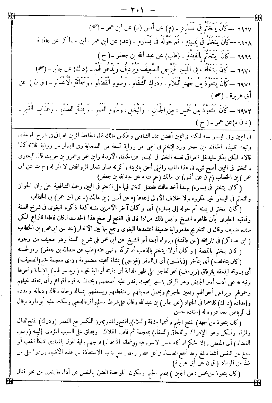 6972 - (كان يتعوذ من خمس: من الجبن) بضم الجيم وسكون الموحدة الضن بالنفس عن أداء ما يتعين من نحو -[202]- قتال العدو (والبخل) أي منع بذل الفضل سيما للمحتاج وحب الجمع والادخار (وسوء العمر) أي عدم البركة فيه بقوة الطاعة والإخلال بالواجبات (وفتنة الصدر) بفتح الصاد وسكون الدال المهملتين ما ينطوي عليه الصدر من نحو حسد وغل وعقيدة زائغة (وعذاب القبر) أي التعذيب فيه بنحو ضرب أو نار أو غيرهما على ما وقع التقصير فيه من المأمورات أو المنهيات والقصد بذلك تعليم الأمة كيف يتعوذون