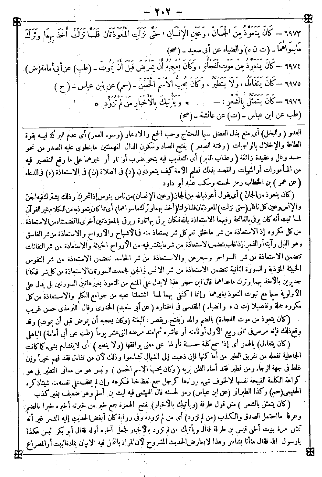 6973 - (كان يتعوذ من الجان) أي يقول أعوذ بالله من الجان (وعين الإنسان) من ناس ينوس إذا تحرك وذلك يشترك فيه الجن والإنس وعين كل ناظر (حتى نزلت) المعوذتان فلما نزلتا (أخذ بهما وترك ما سواهما) أي مما كان يتعوذ به من الكلام غير القرآن لما ثبت أنه كان يرقي بالفاتحة وفيهما الاستعاذة بالله فكان يرقي بها تارة ويرقي بالمعوذتين أخرى لما تضمنتاه من الاستعاذة من كل مكروه إذ الاستعاذة من شر ما خلق تعم كل شر يستعاذ منه في الأشباح والأرواح والاستعاذة من شر الغاسق وهو الليل وآيته أو القمر إذا غاب يتضمن الاستعاذة من شر ما ينتشر فيه من الأرواح الخبيثة والاستعاذة من شر النفاثات تتضمن الاستعاذة من شر السواحر وسحرهن والاستعاذة من شر الحاسد تتضمن الاستعاذة من شر النفوس الخبيثة المؤذية والسورة الثانية تتضمن الاستعاذة من شر الإنس والجن فجمعت السورتان الاستعاذة من كل شر فكانا جديرين بالأخذ بهما وترك ماعداهما. قال ابن حجر: هذا لا يدل على المنع من التعوذ بغير هاتين السورتين بل يدل على الأولوية سيما مع ثبوت التعوذ بغيرهما وإنما اكتفى بهما لما اشتملتا عليه من جوامع الكلم والاستعاذة من كل مكروه جملة وتفصيلا