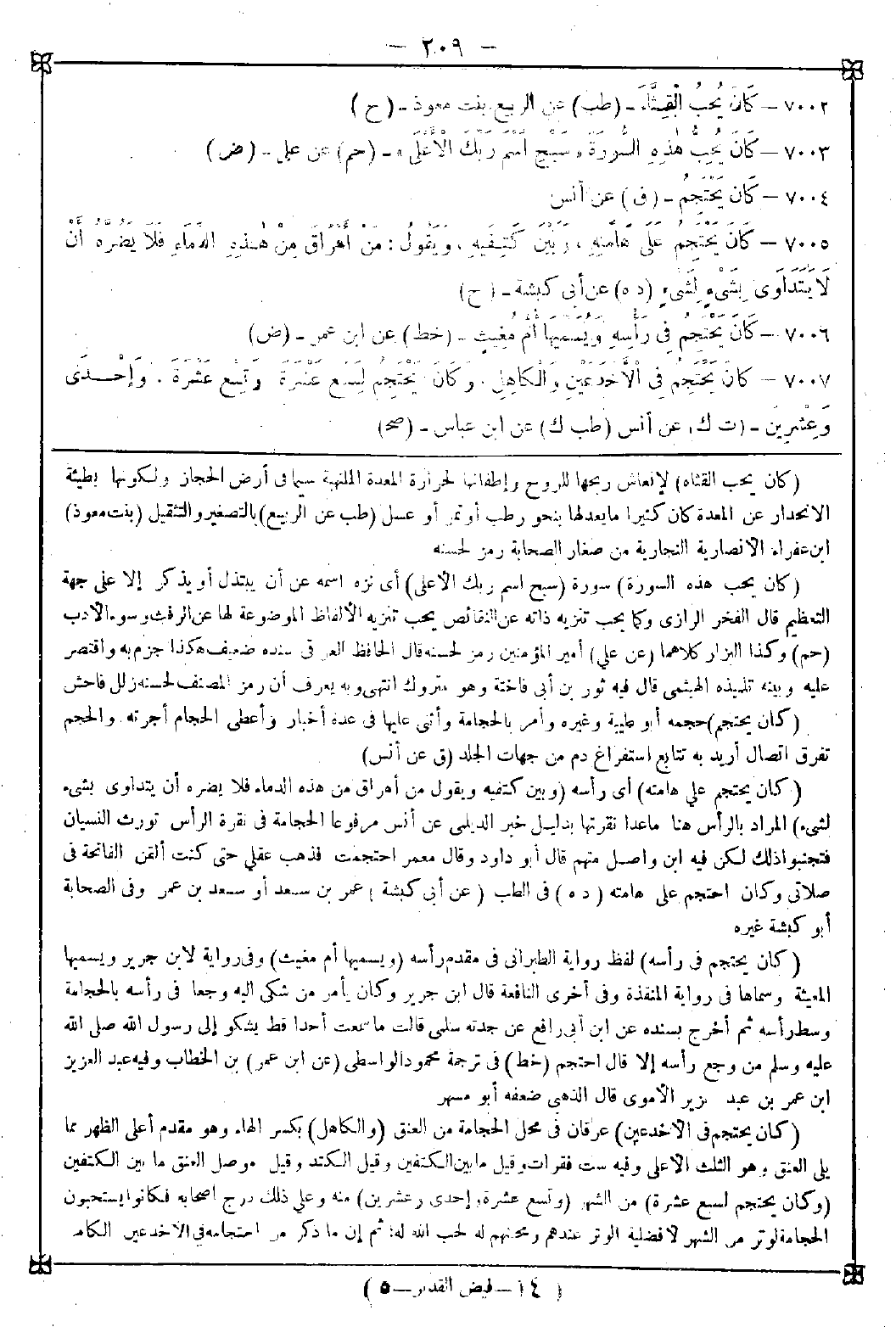 7004 - (كان يحتجم) حجمه أبو طيبة وغيره وأمر بالحجامة وأثنى عليها في عدة أخبار وأعطى الحجام أجرته والحجم تفرق اتصال أريد به تتابع استفراغ دم من جهات الجلد