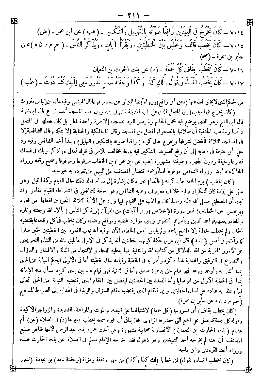 7014 - (كان يخرج في العيدين) إلى المصلى الذي على باب المدينة الشرقي بينه وبين باب المسجد ألف ذراع قال ابن شيبة قال ابن القيم: وهو الذي يوضع فيه محمل الحاج ولم يصل العيد بمسجده إلا مرة واحدة لمطر بل كان يفعلها في المصلى دائما ومذهب الحنفية: أن صلاتها بالصحراء أفضل من المسجد وقال المالكية والحنابلة: إلا بمكة وقال الشافعية: إلا في المساجد الثلاثة فأفضل لشرفها ويخرج حال كونه (رافعا صوته بالتكبير والتهليل) وبهذا أخذ الشافعي وفيه رد على أبي حنيفة في ذهابه إلى أن رفع الصوت بالتكبير فيه بدعة مخالف للأمر في قوله تعالى {واذكر ربك في نفسك تضرعا وخيفة ودون الجهر} وصيغته مشهورة
