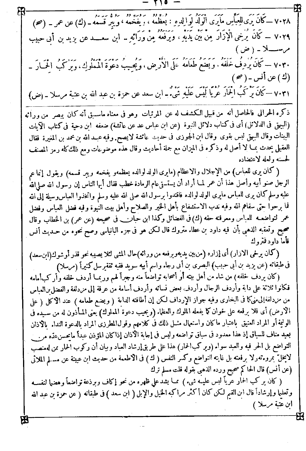 7031 - (كان يركب الحمار عريا ليس عليه شيء) مما يشد على ظهره من نحو إكاف وبرذعة تواضعا وهضما لنفسه وتعليما وارشادا قال ابن القيم: لكن كان أكثر مراكبه الخيل والإبل