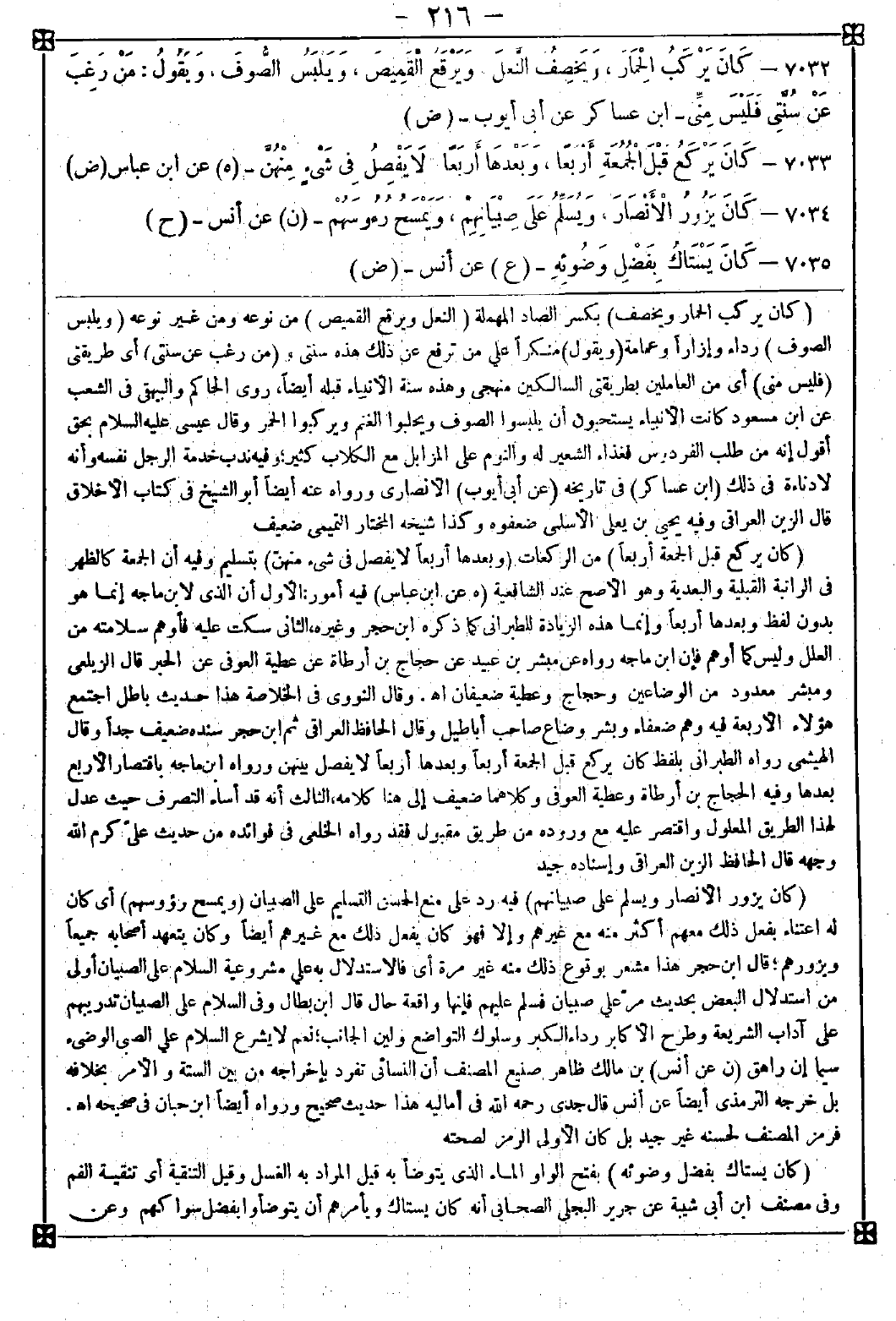 -[216]- 7032 - (كان يركب الحمار ويخصف) بكسر الصاد المهملة (النعل ويرقع القميص) من نوعه ومن غير نوعه (ويلبس الصوف) رداء وإزارا وعمامة (ويقول) منكرا على من ترفع عن ذلك هذه سنتي و (من رغب عن سنتي) أي طريقتي (فليس مني) أي من العاملين بطريقتي السالكين منهجي وهذه سنة الأنبياء قبله أيضا روى الحاكم والبيهقي في الشعب عن ابن مسعود كانت الأنبياء يستحبون أن يلبسوا الصوف ويحلبوا الغنم ويركبوا الحمر وقال عيسى عليه السلام: بحق أقول إنه من طلب الفردوس فغذاء الشعير له والنوم على المزابل مع الكلاب كثير وفيه ندب خدمة الرجل نفسه وأنه لا دناءة في ذلك