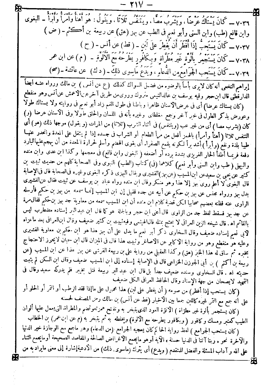 7038 - (كان يستجمر بألوة غبر مطراة) الألوة العود الذي يتبخر به وتفتح همزته وتضم والمطراة التي يعمل عليها ألوان الطيب كعنبر ومسك وكافور (وبكافور يطرحه مع الألوة) ويخلطه به ثم يتبخر به