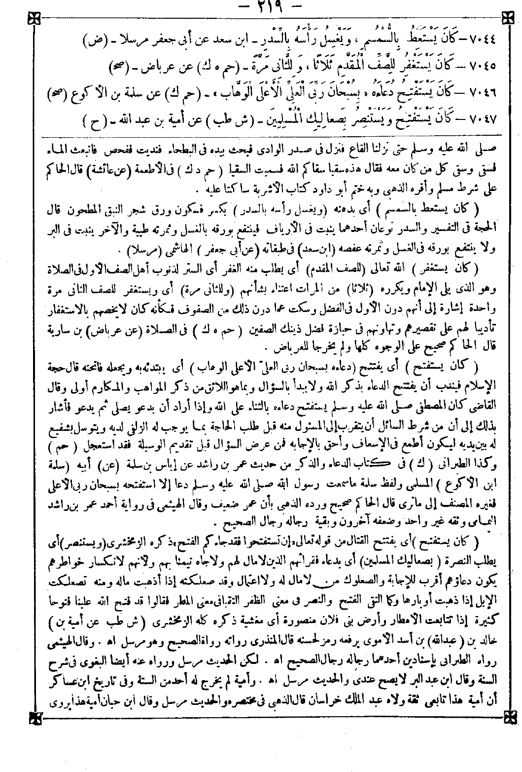 7047 - (كان يستفتح) أي يفتتح القتال من قوله تعالى {إن تستفتحوا فقد جاءكم الفتح} ذكره الزمخشري (ويستنصر) أي بطلب النصرة (بصعاليك المسلمين) أي بدعاء فقرائهم الذين لا مال لهم ولاجاه تيمنا بهم ولأنهم لانكسار خواطرهم يكون دعاؤهم أقرب للإجابة والصعلوك من لا مال له ولا اعتمال وقد صعلكته إذا أذهبت ماله ومنه تصعلكت الإبل إذا ذهبت أوبارها وكما التقى الفتح والنصر في معنى الظفر التقيا في معنى المطر فقالوا: قد فتح الله علينا فتوحا كثيرة إذا تتابعت الأمطار وأرض بني فلان منصورة أي مغشية ذكره كله الزمخشري